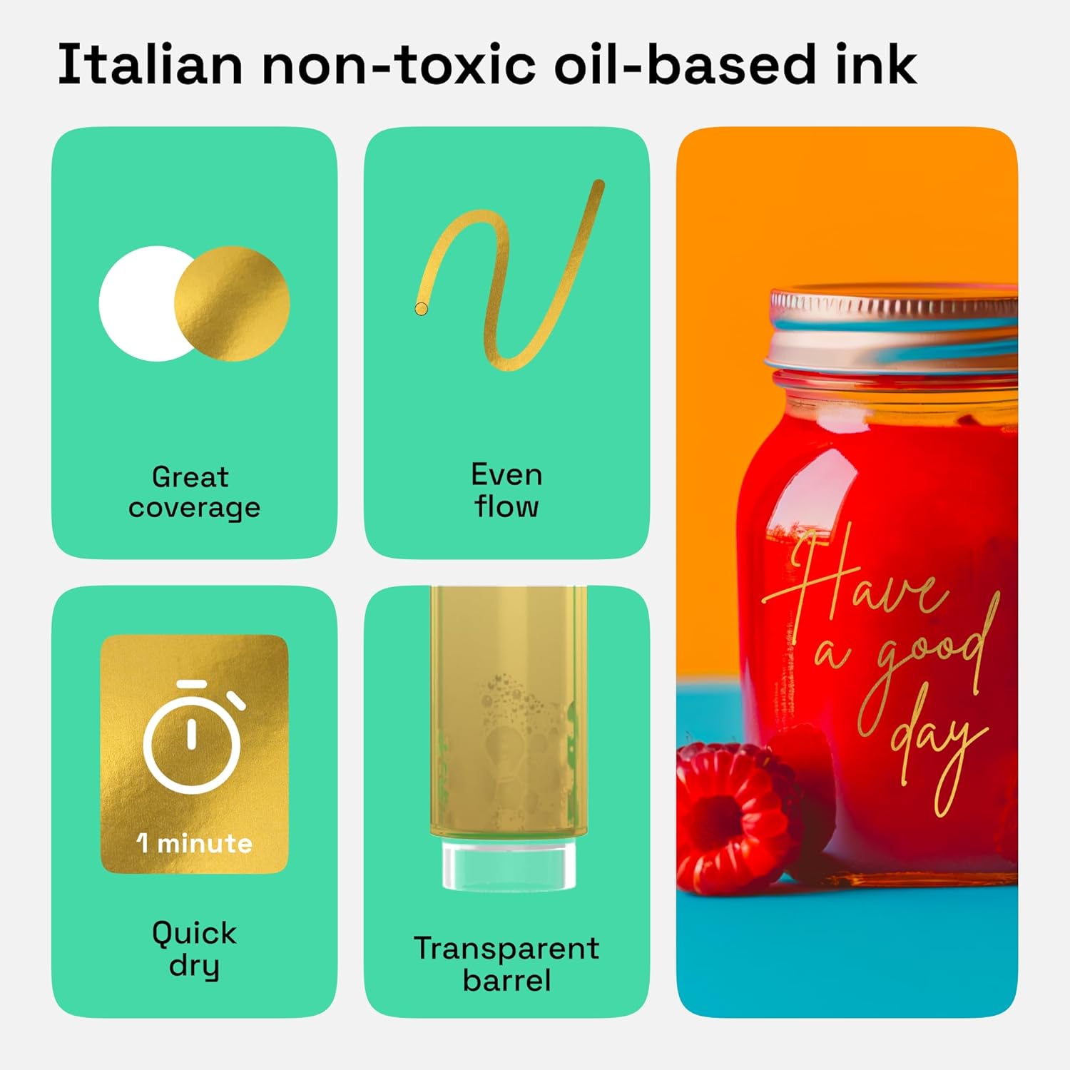 - Multiple Surfaces: Use these gold oil paint pens as oil markers for plastic and glass or as oil based fabric markers for clothes. Each oil based pen is water-resistant. Theyโre also good for leather, vinyl, or epoxy resin. And the nibs are solid, even on rocks!