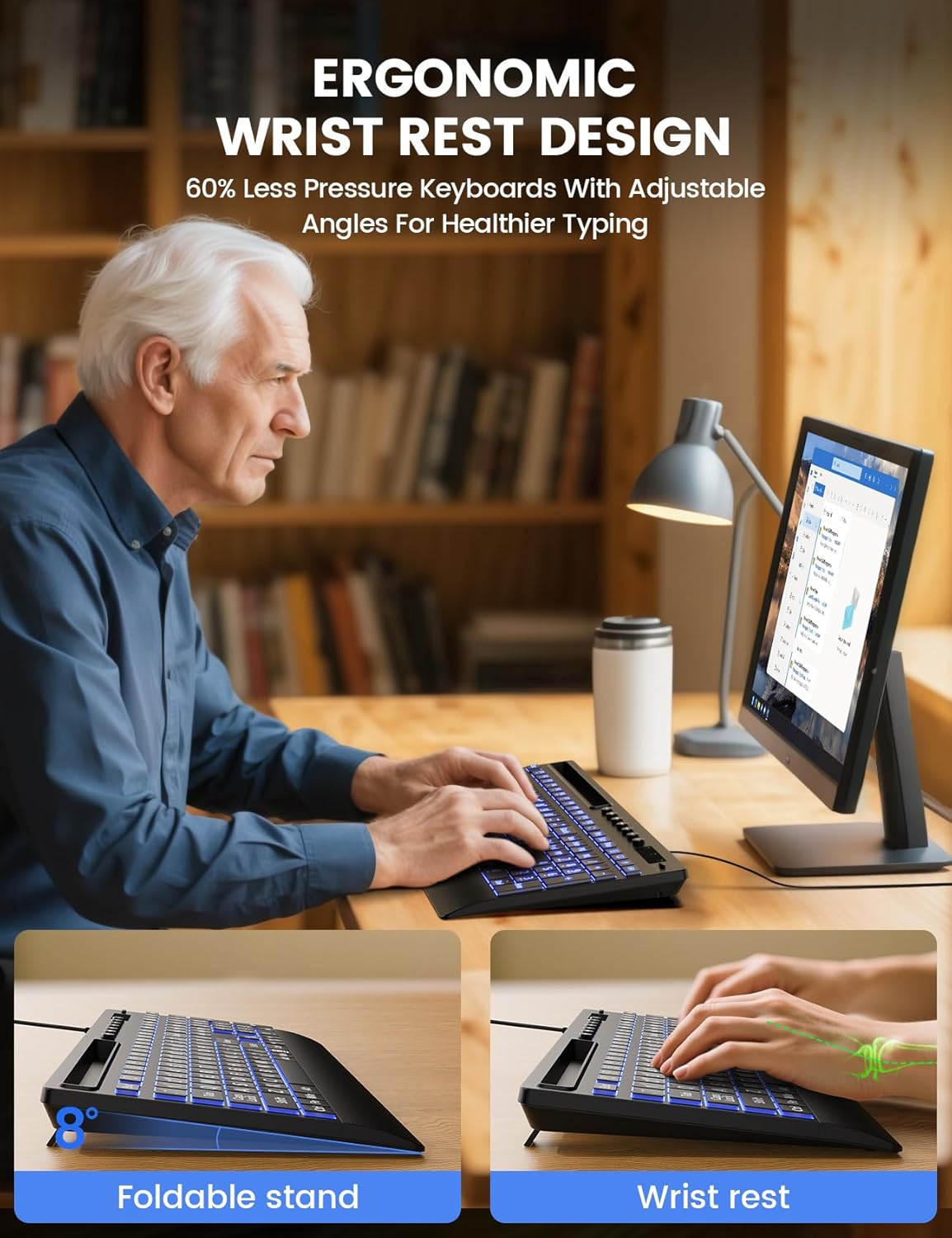 - ERGONOMIC COMFORT DESIGN: Unfold the foldable stand at the back of the keyboard and use the wrist rest to reduce hand fatigue, making long hours of typing more comfortable.