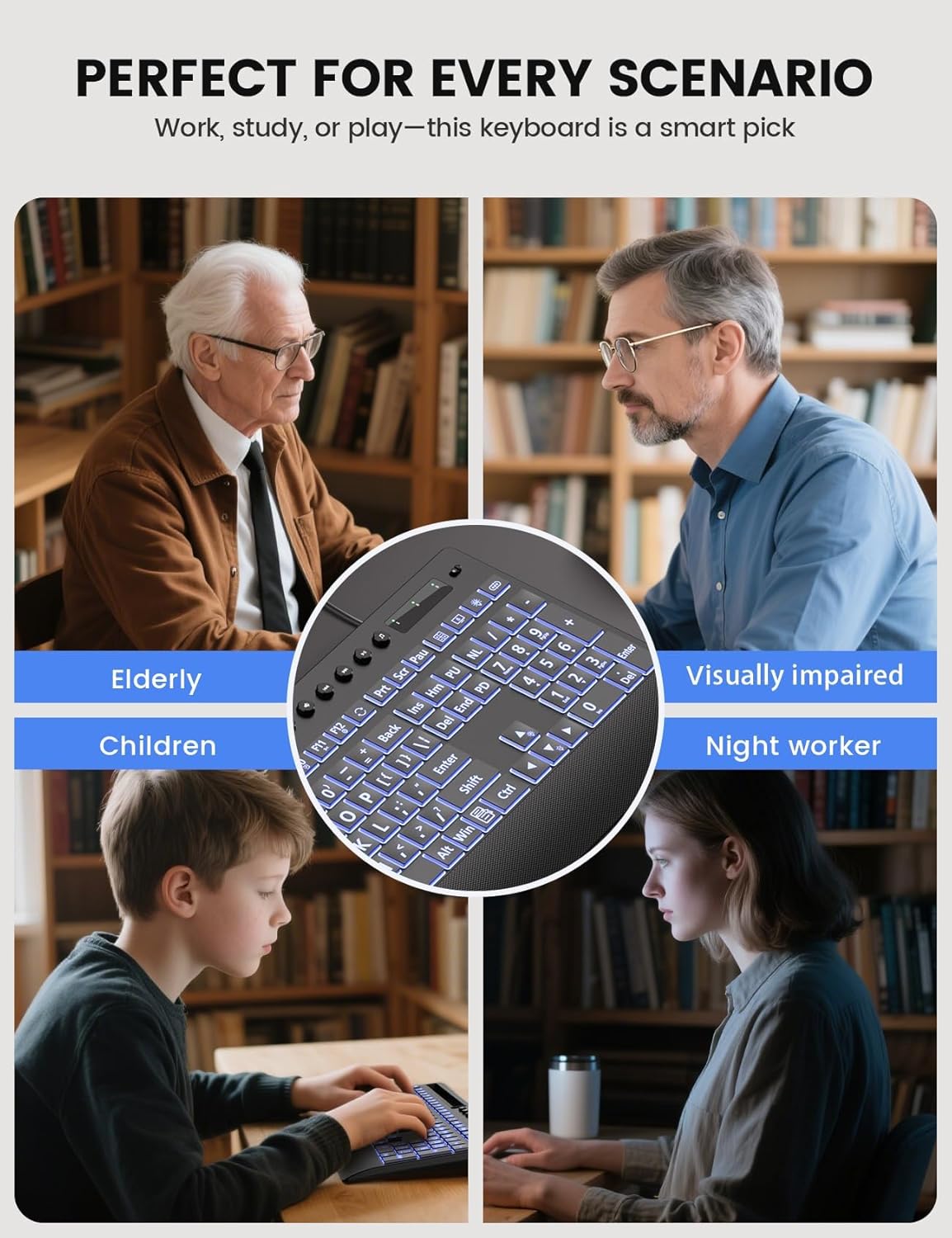 - LARGE PRINT KEYBOARD: 3X larger than standard keyboard fonts, clear and easy to identify, effectively helping users with visual difficulties. Perfect for the elderly, visually impaired, students, office workers, schools, special needs departments and libraries, etc.