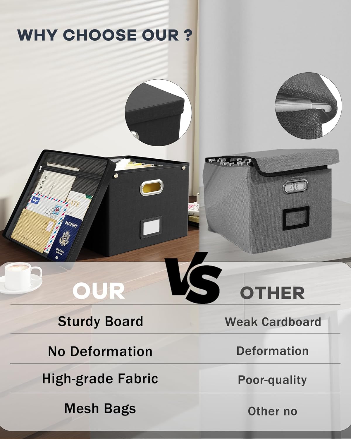 - 【Extra Mesh Bag on Lid】Black letter size file organizer box has an extra mesh pocket on lid which can store little things such as pens, invoices, papers, scissors,etc. With more storage space design, more efficient storage of documents and items.