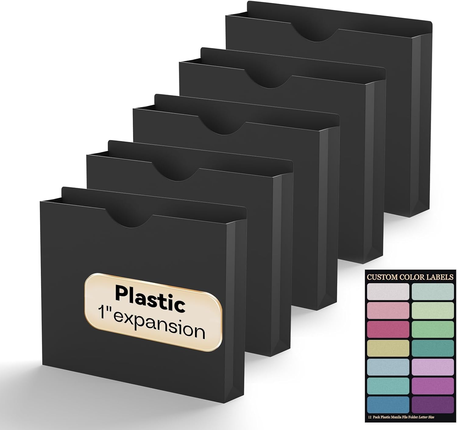Plastic 1 Inch File Jackets Letter Size,12 Pack Reinforced Manilla Pocket Folders,Poly Expandable File Jacket for Documents,Heavy Duty Expansion Pocket Files with Straight Cut Tabs,Black