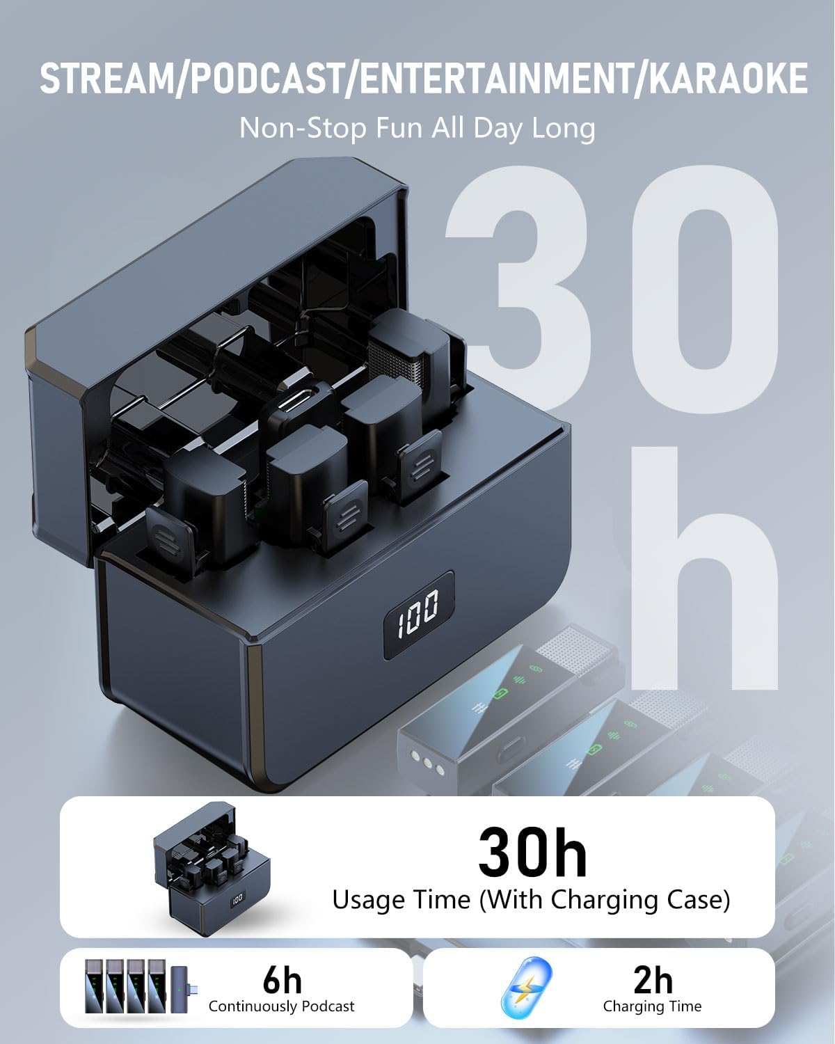 - Impressive Battery Life: Power That Keeps Up with Your Creativity. Running out of battery in the middle of an important recording session is a nightmare for any content creator. The ZERFUN 4 Wireless Lavalier Microphone System puts those concerns to rest with its outstanding battery performance. You can enjoy up to 30 hours of continuous usage with the included charging case, making it perfect for long shoots, multi-day events, or extended podcasting sessions. Even without the charging case, the microphone offers 6 hours of non-stop podcasting, more than enough for most standard recording needs. And when the battery does run low, a quick 2-hour charge gets it fully powered up again.