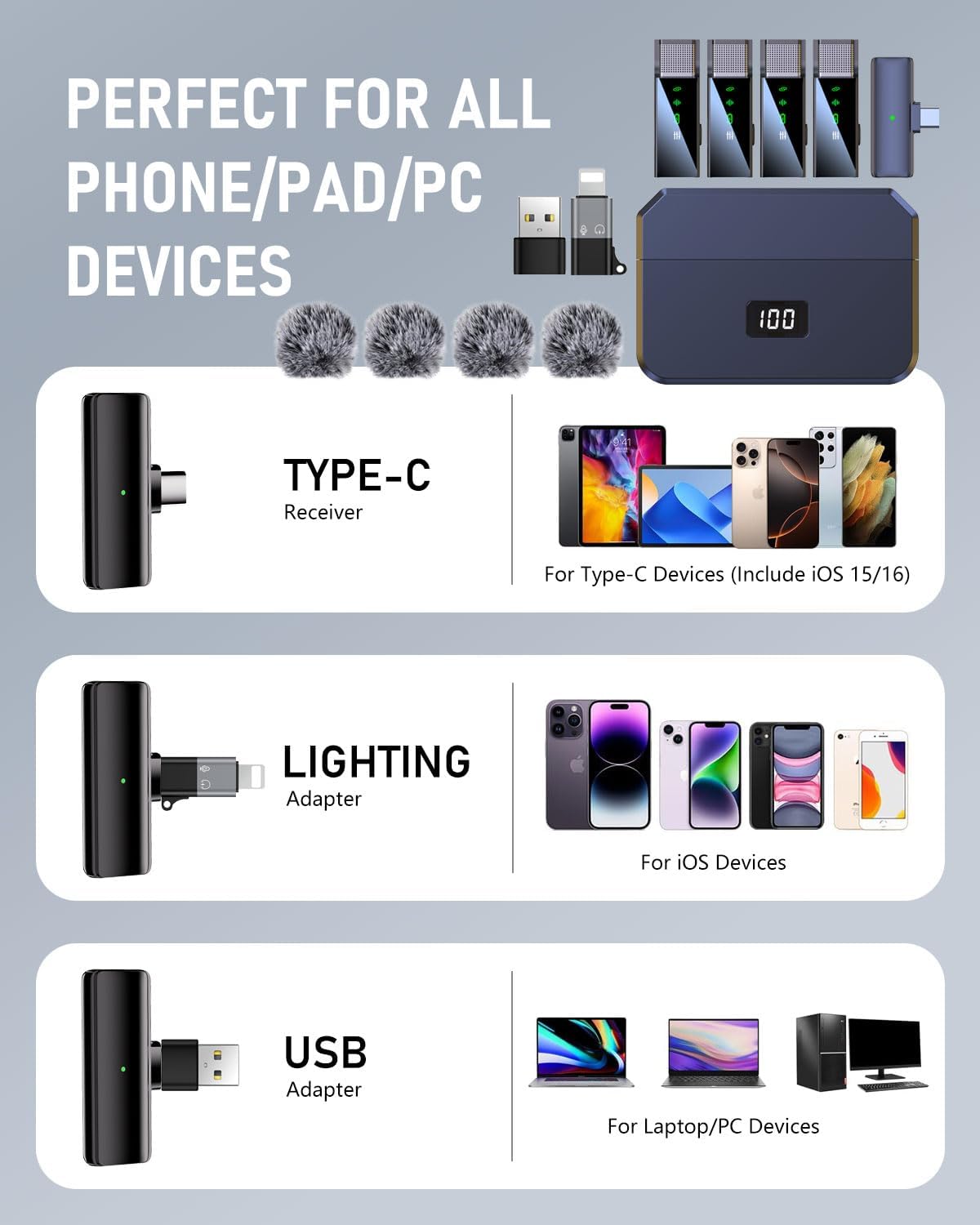 4 Wireless Lavalier Microphone for iPhone Android Phone PC, Pro Lapel Mic System with USB-C/Lightning, 48KHz 24Bit,30H Battery, Noise Cancelling, Reverb for Video Recording Podcast Stream Vlog