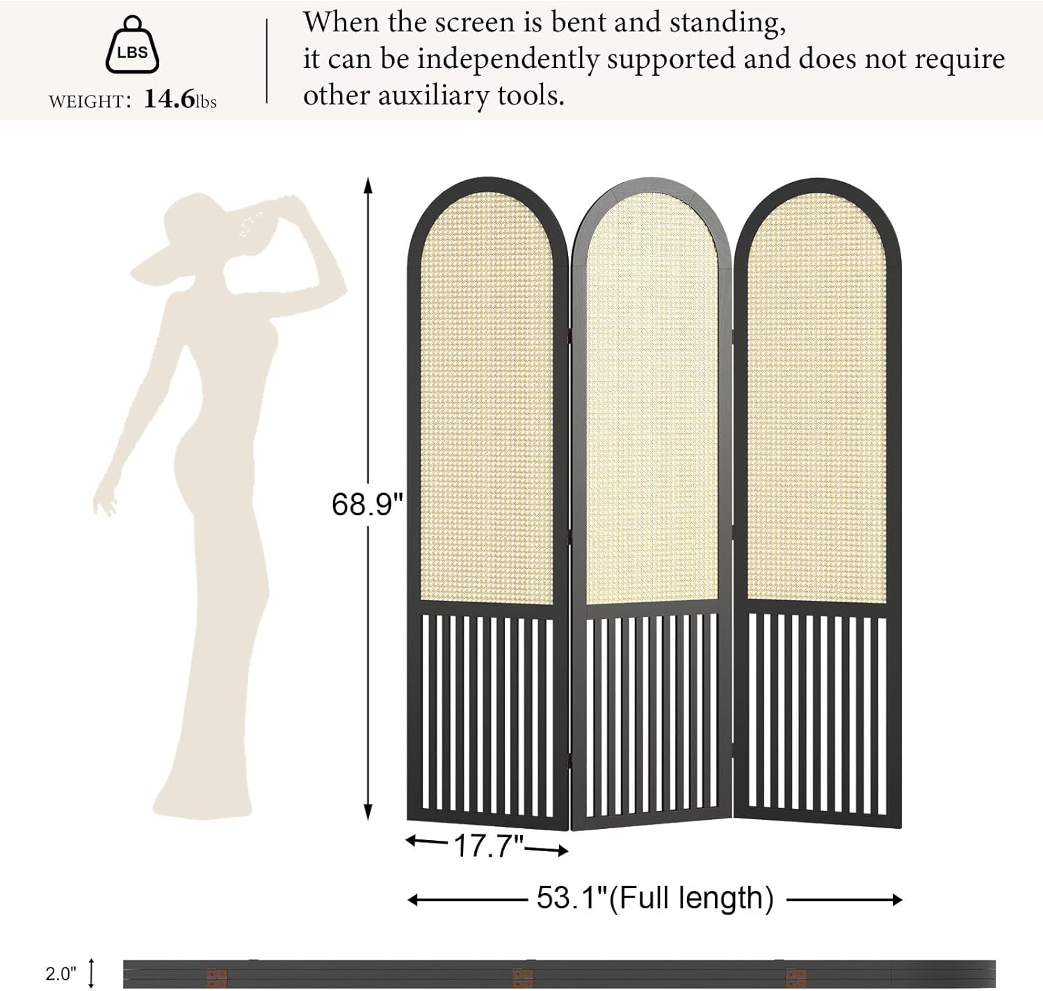 3-Panel Hand-Woven Rattan Room Divider, Tall Foldable Privacy Screen with Wooden Frame - Freestanding Portable Partition for Home Office, Bedroom, Bathroom(Black-Pine)