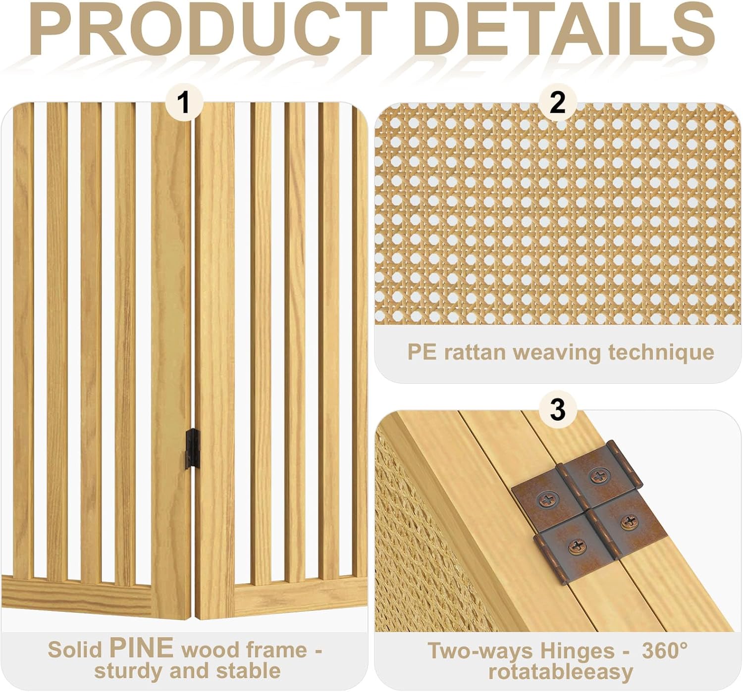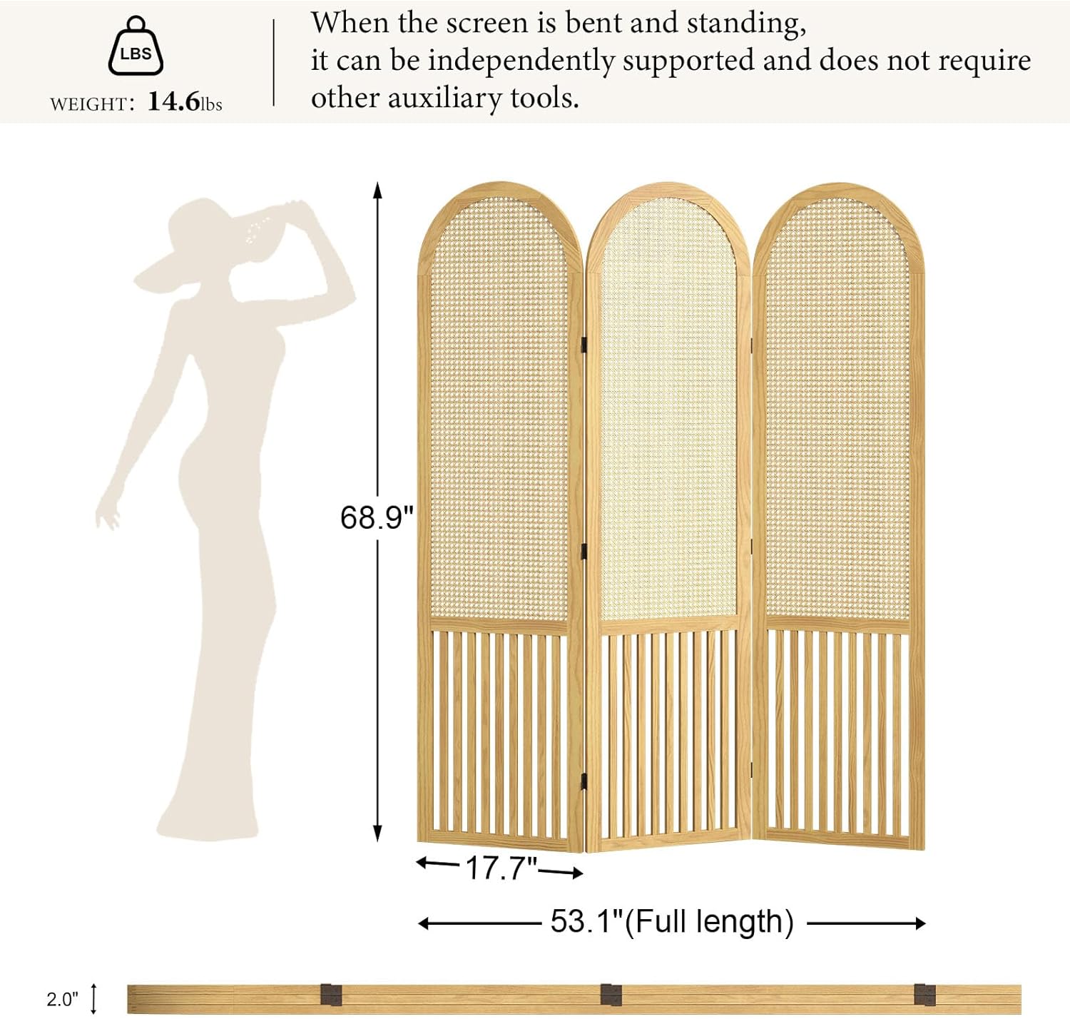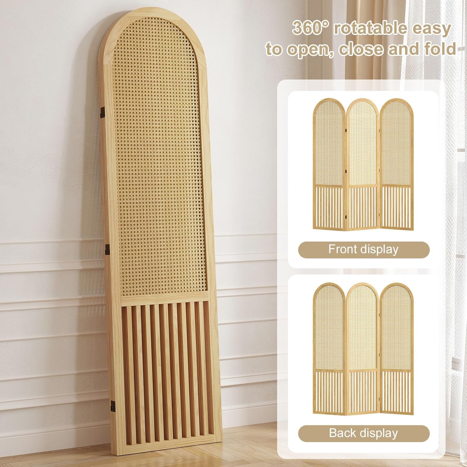 3-Panel Hand-Woven Rattan Room Divider, Tall Foldable Privacy Screen with Wooden Frame - Freestanding Portable Partition for Home Office, Bedroom, Bathroom(Natural-Pine)