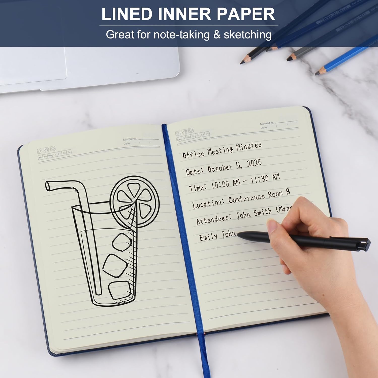 - 192 Pages Lined Journal Notebooks: 6 blue hardcover notebook, 192 pages/96 sheets per notebook (1152 pages/ 576 sheets in total), adequate for work, meeting, studying. The paper of the leather notebook is thick enough that ink won't bleed through. The light yellow paper is more eyes comforting, release eyes burden when writing. It is the ideal notebook for work, school, meeting, travel and dairy