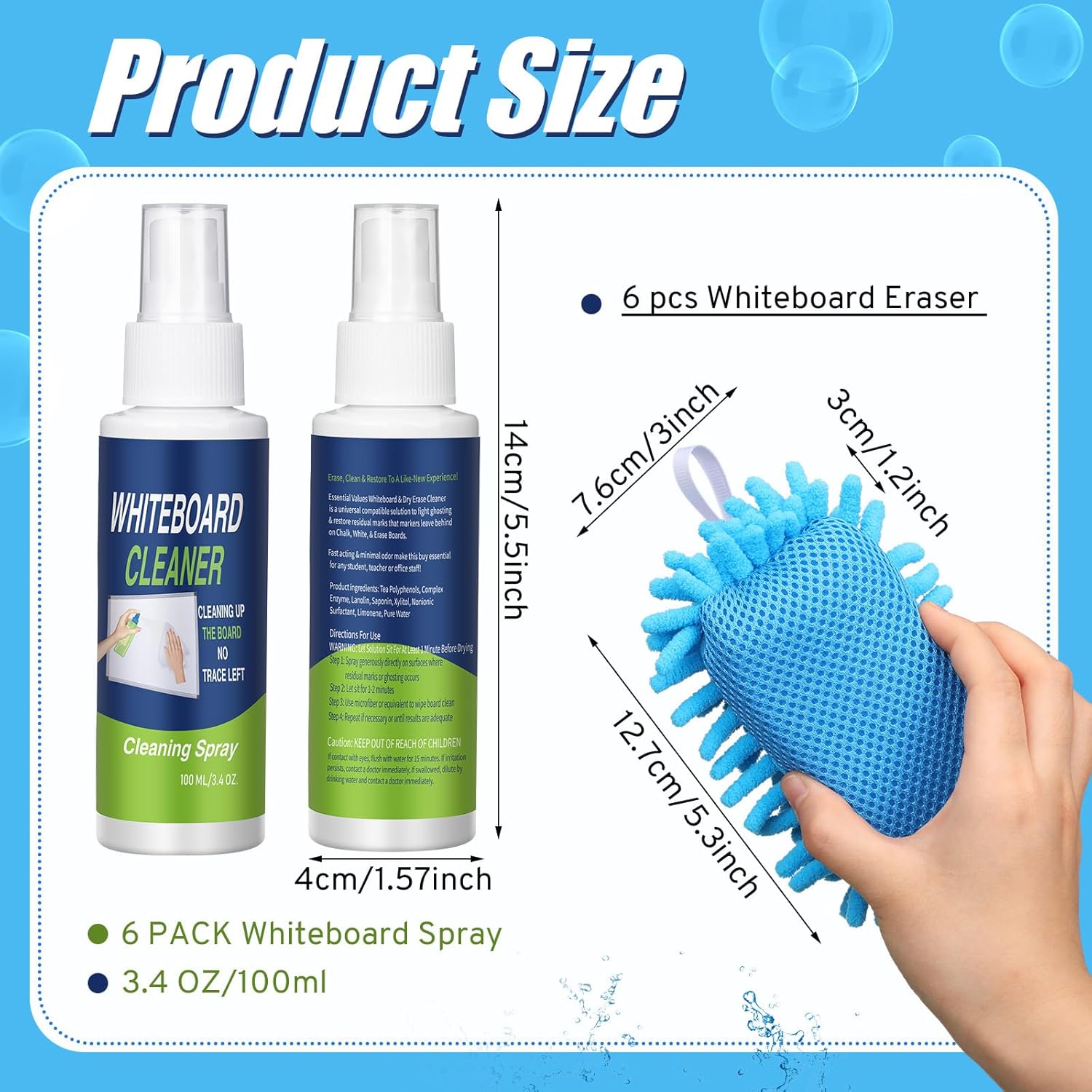 - Packing information: You will get 6 bottles of whiteboard cleaner spray, each bottle is 100 ml, and 6 colorful magnetic microfiber coarse-haired dry erase board erasers, the size is about 12 x 7 x 3 cm, this combination can help you easily erase stains on the blackboard