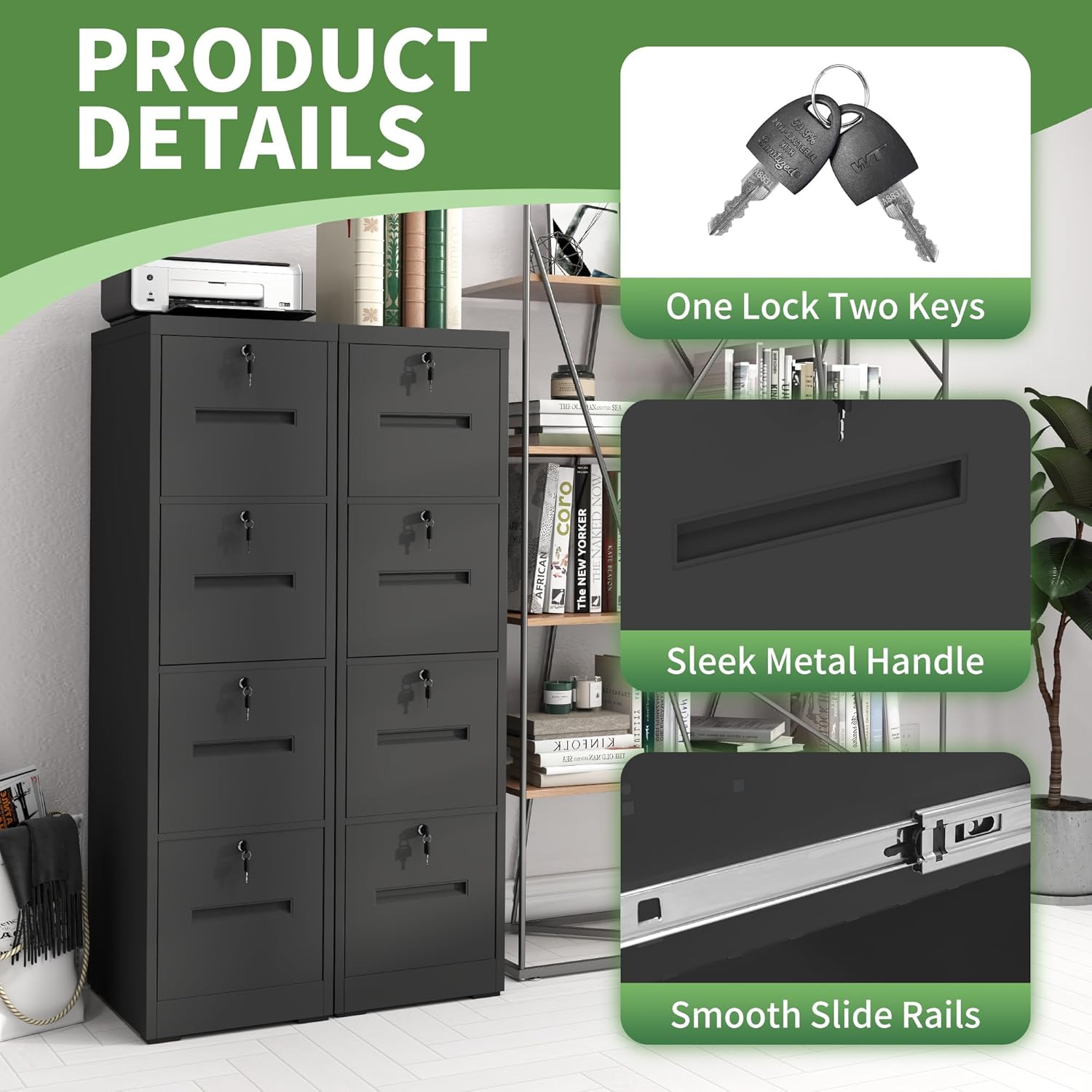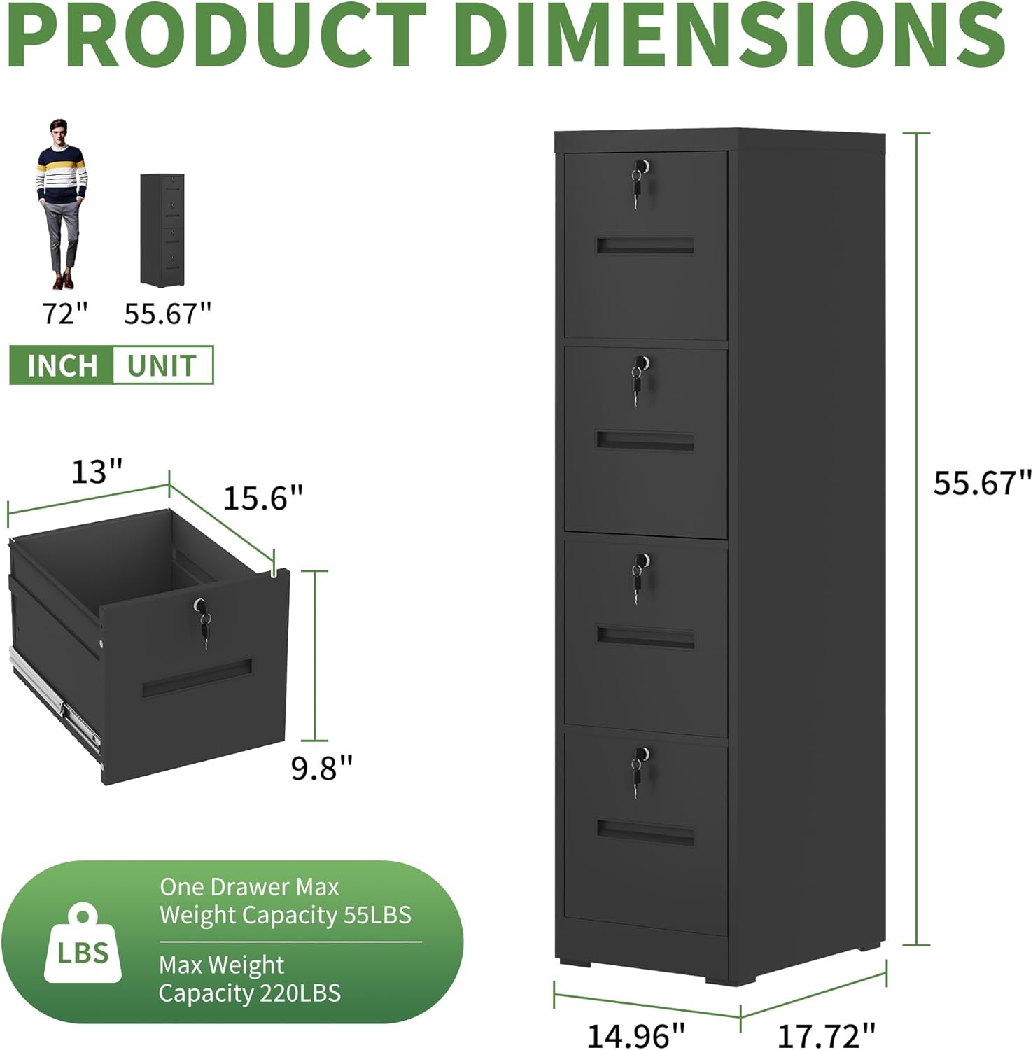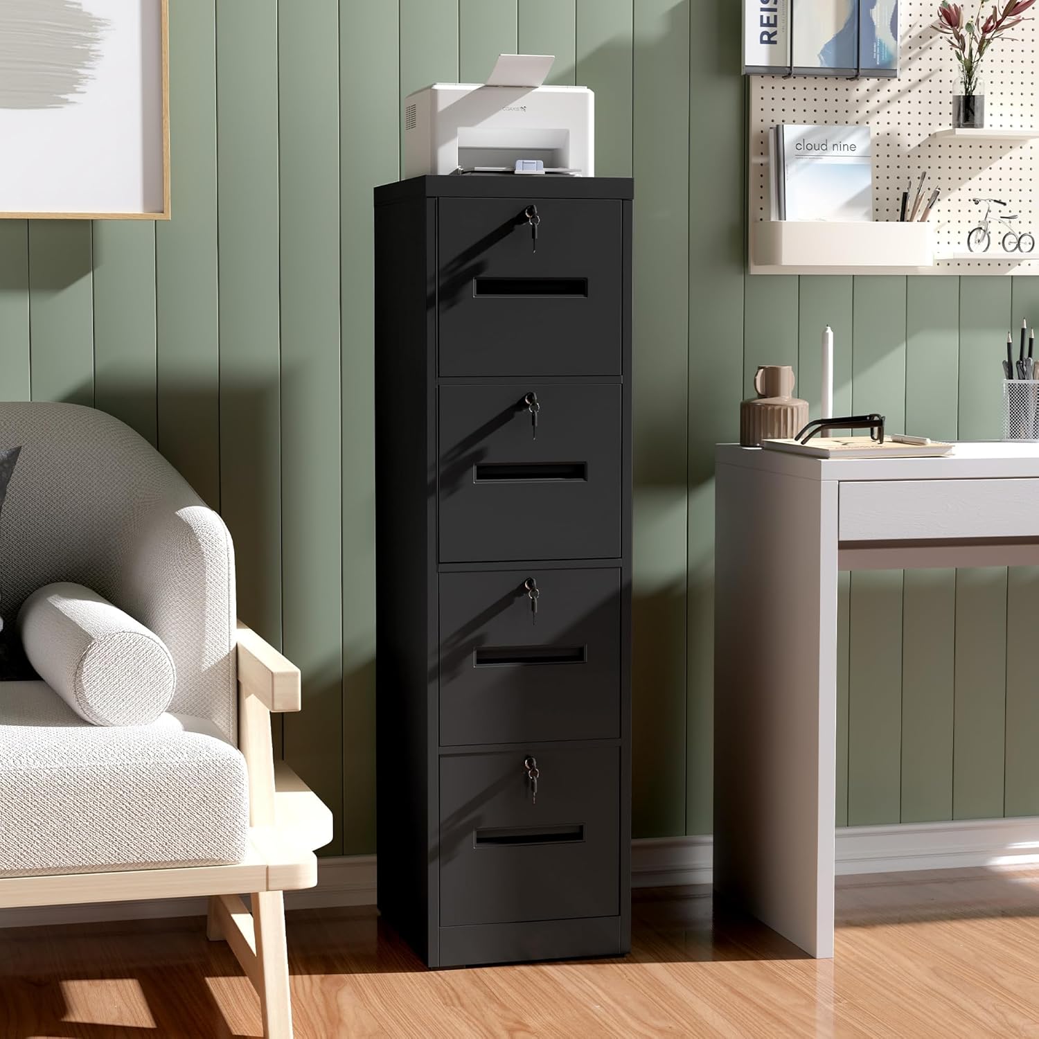File Cabinet 4 Drawer with Lock, Vertical Filing Cabinets for Home Office, Metal Steel Storage Cabinet for Letter/Legal Size File, Assembly Required(Black)