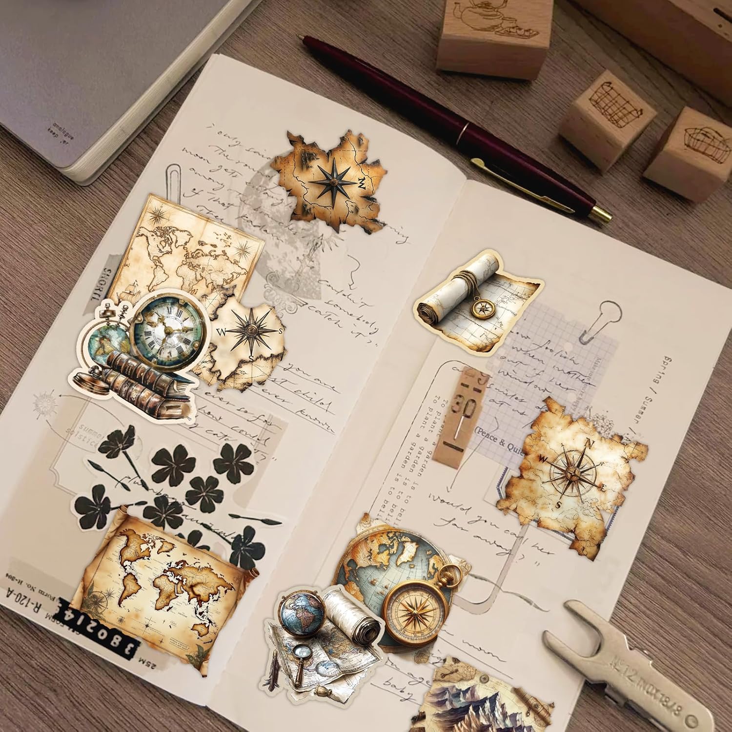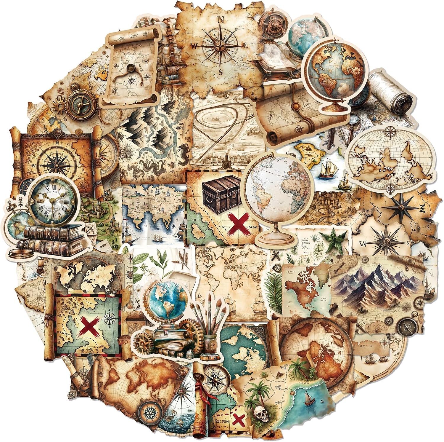 PRSTINCOL 100Pcs Vintage Sticker Pack,Cute Map Design Scrapbook Supplies, Vintage Aesthetic Junk Journal Accessories, Waterproof Vinyl Stickers for Water Bottles, Planners, Journals