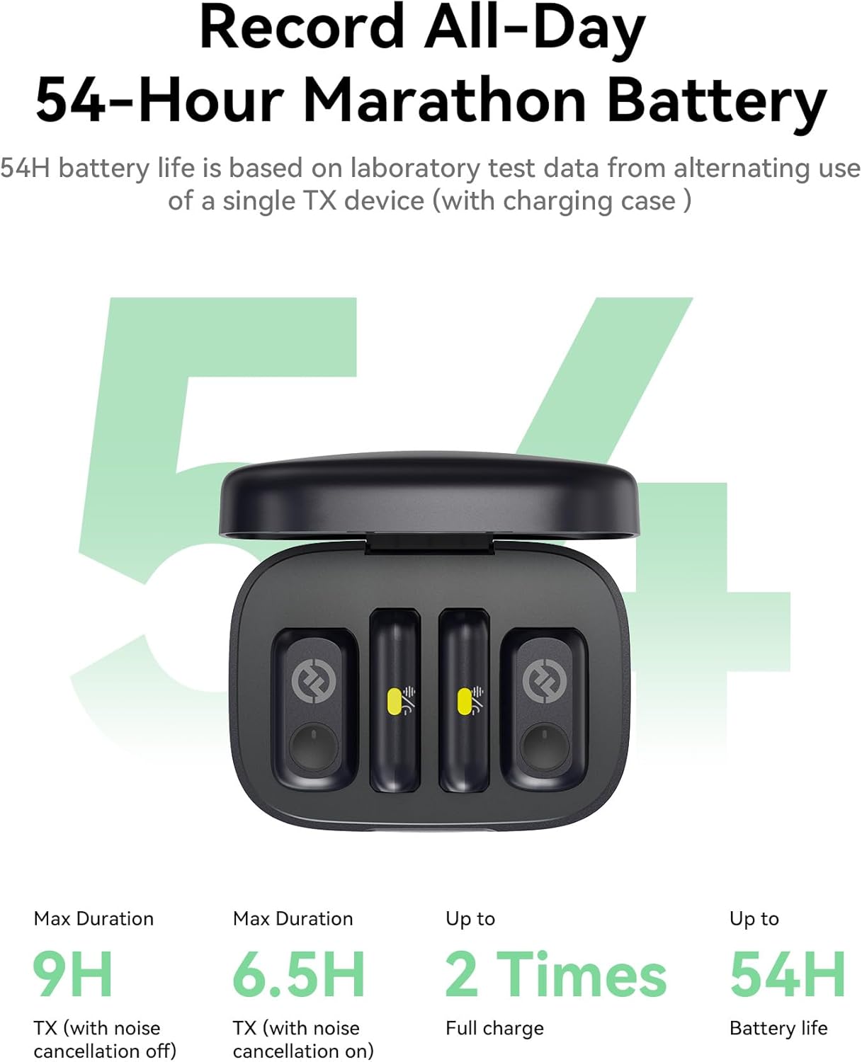 - Up to 54h Battery Life: Achieve up to 54h using one transmitter (TX) alternately with the charging case—ideal for long shooting days without battery anxiety.