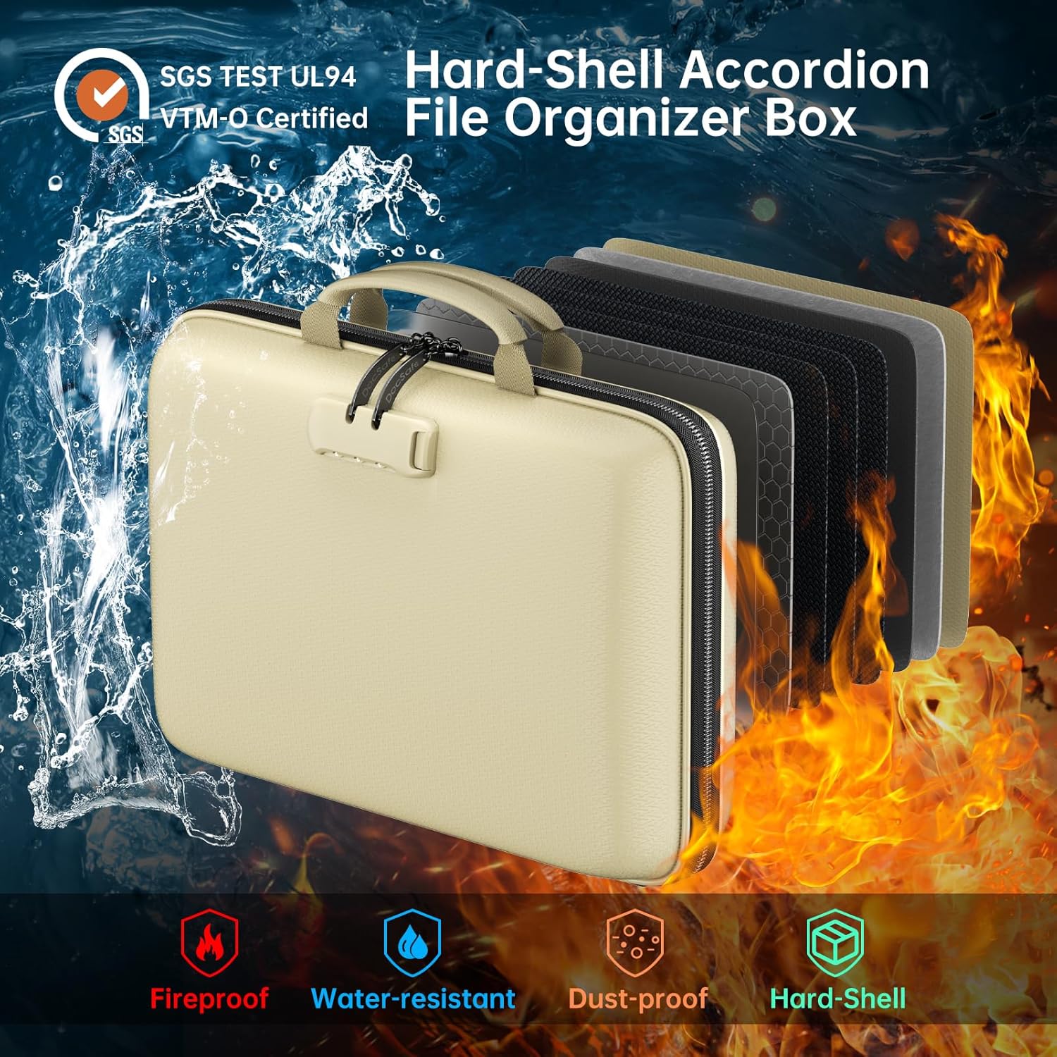 - Ultimate Fireproof & Water-Resistant Protection: Keep your valuables safe with our DocSafe Hard-Shell fireproof file organizer. It is made of thickened silicone coated fireproof heat insulated cotton material and hard-shell material which can stands up against fire and passed the SGS TEST(UL-94 VTM-0 Burning Test). Fireproof box is both fireproof and water-resistant, ensuring your documents stay protected during fires, floods, or wet weather. It may fit both letter and legal-size files