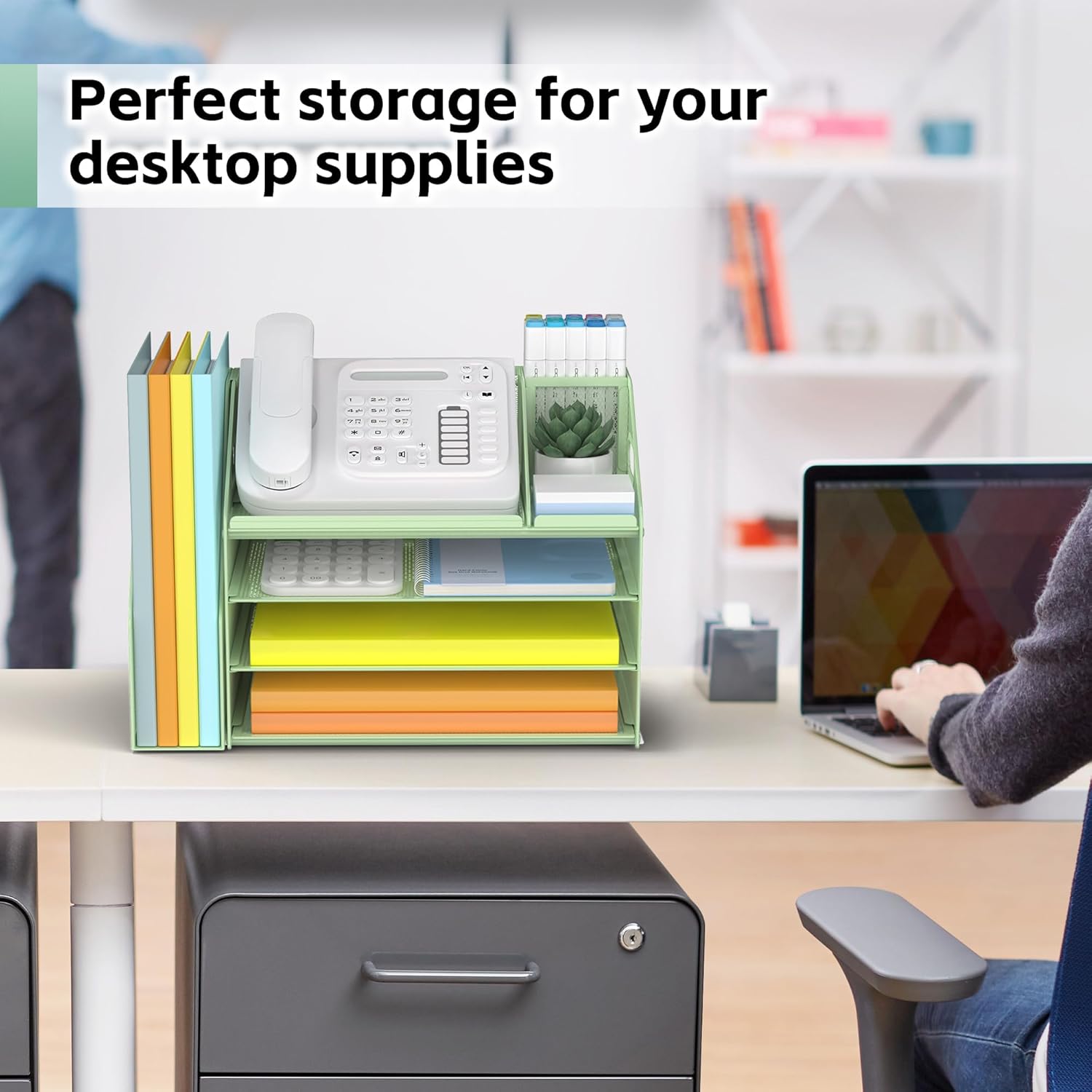- 4 Tier Organization with Pen Holder: This Green desk organizer boasts a 4-tier design for efficient sorting of your papers, letters, and other office supplies, along with a dedicated pen holder. It's perfect for maintaining a tidy and uncluttered workspace. The desk file organizer is an essential desk accessory that contributes to an orderly and professional atmosphere