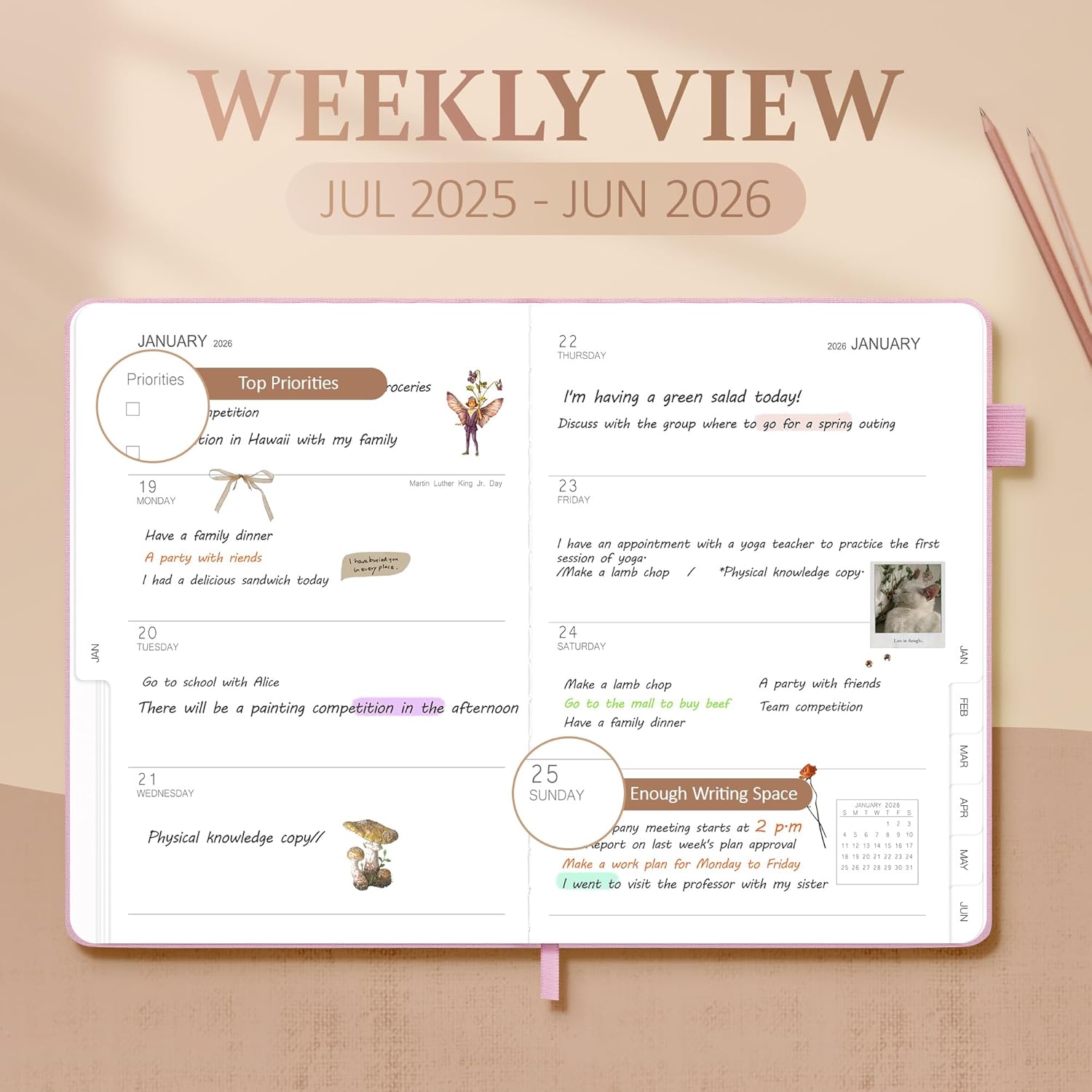 - 2025-2026 planner: Simplify your schedule with the 2025-2026 A5 Weekly & Monthly Planner! Featuring 12 months (Jul 2025-Jun 2026) of clean, intuitive layouts, itβs ideal for task management, goal tracking, and time optimization. Students will love the assignment sections, while professionals can streamline projects and meetings. The elegant design, spacious pages, and lay-flat binding make it a joy to use daily. Stay organized, reduce stress, and make every month count!