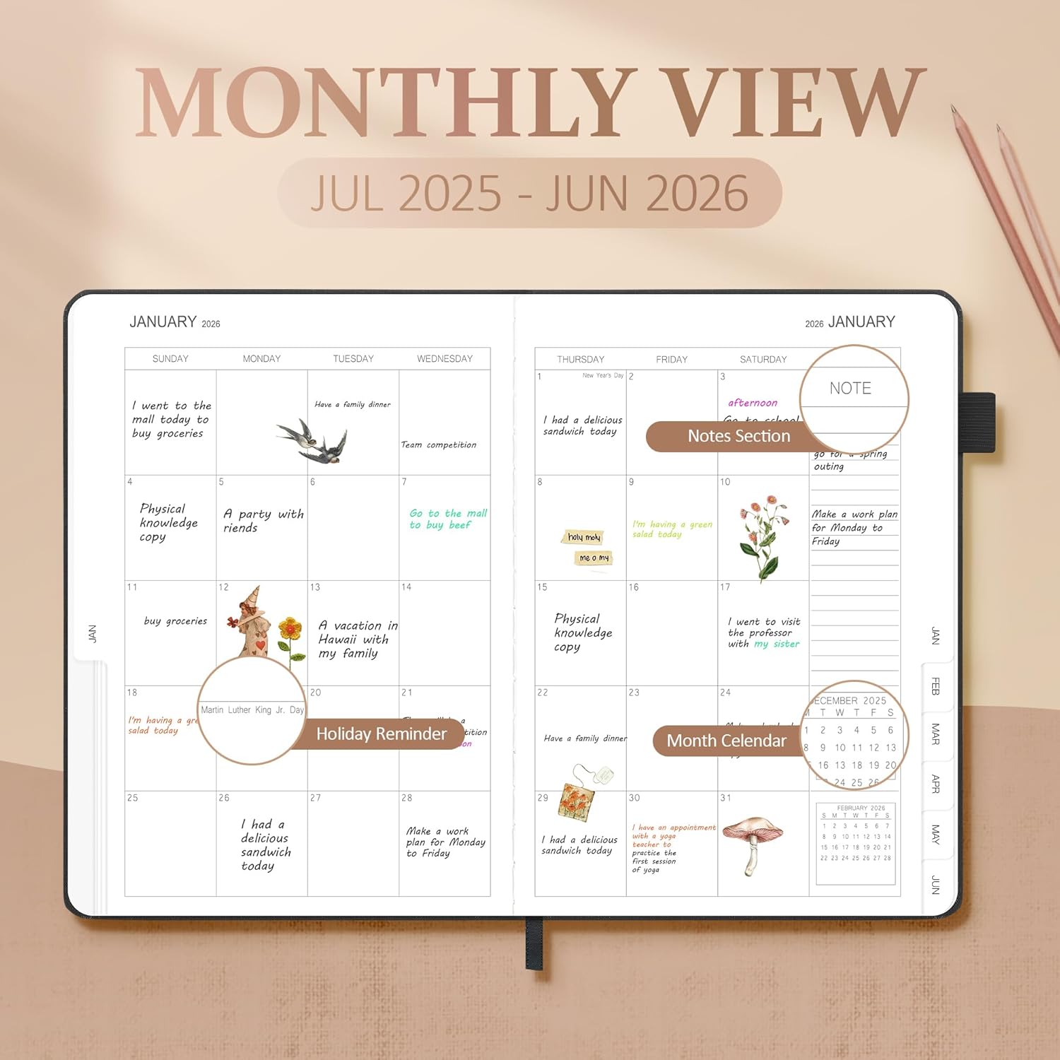 - 2025-2026 planner: Simplify your schedule with the 2025-2026 A5 Weekly & Monthly Planner! Featuring 12 months (Jul 2025-Jun 2026) of clean, intuitive layouts, itβs ideal for task management, goal tracking, and time optimization. Students will love the assignment sections, while professionals can streamline projects and meetings. The elegant design, spacious pages, and lay-flat binding make it a joy to use daily. Stay organized, reduce stress, and make every month count!