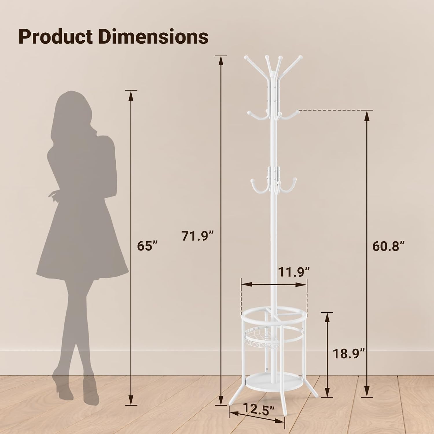 ELYKEN Coat Rack Freestanding, Metal Coat Rack Stand with Umbrella Holder, Modern Coat Tree with 12 Hooks, Floor Standing Corner Hall Tree for Entryway Living Room Bedroom Office, White