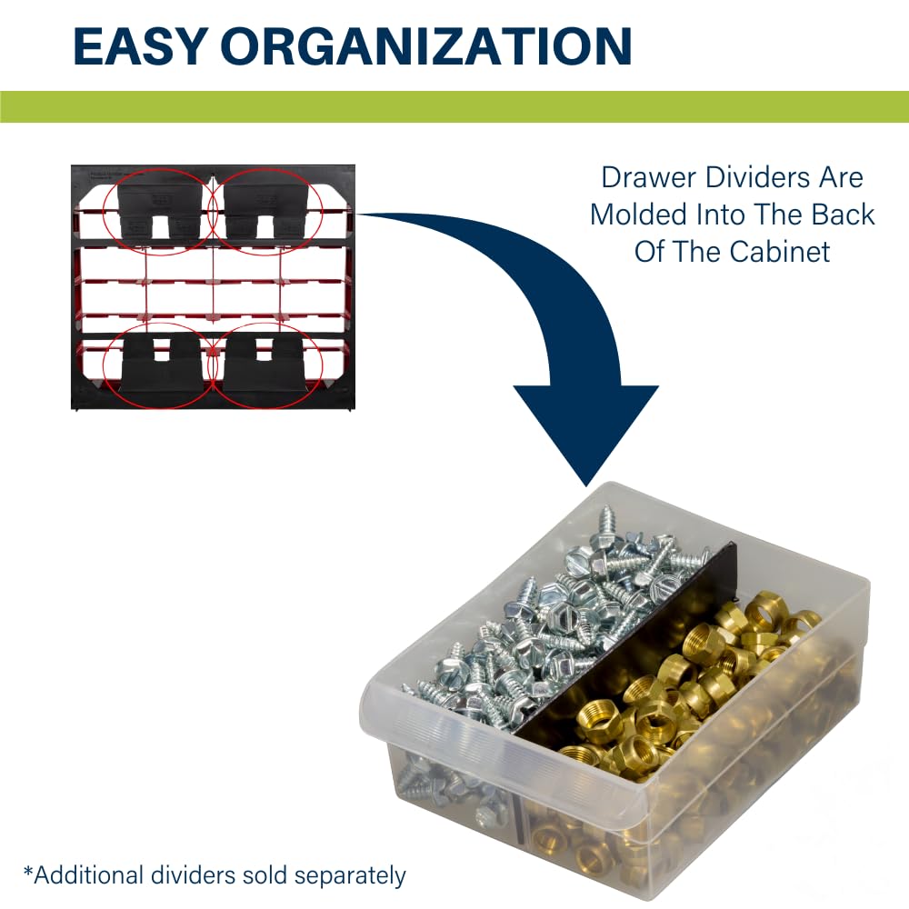 - FEATURES: Stack cabinets securely or use keyhole slots to mount for wall storage; Finger-grip drawer pulls provide easy access; Rear stop tabs prevent contents from spilling; Drawer dividers are included and molded into the back of the cabinet