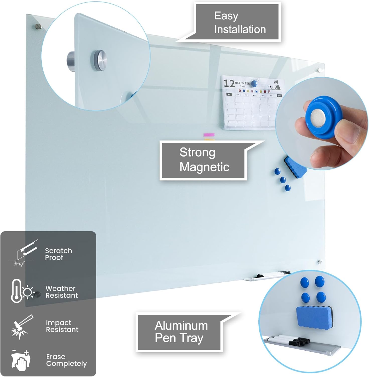 - ACCESSORIES INCLUDED β Measures 48" x72". Comes with removable accessory tray, 1 Magntic Wraser,2 markers and 2 high power glass board magnets.