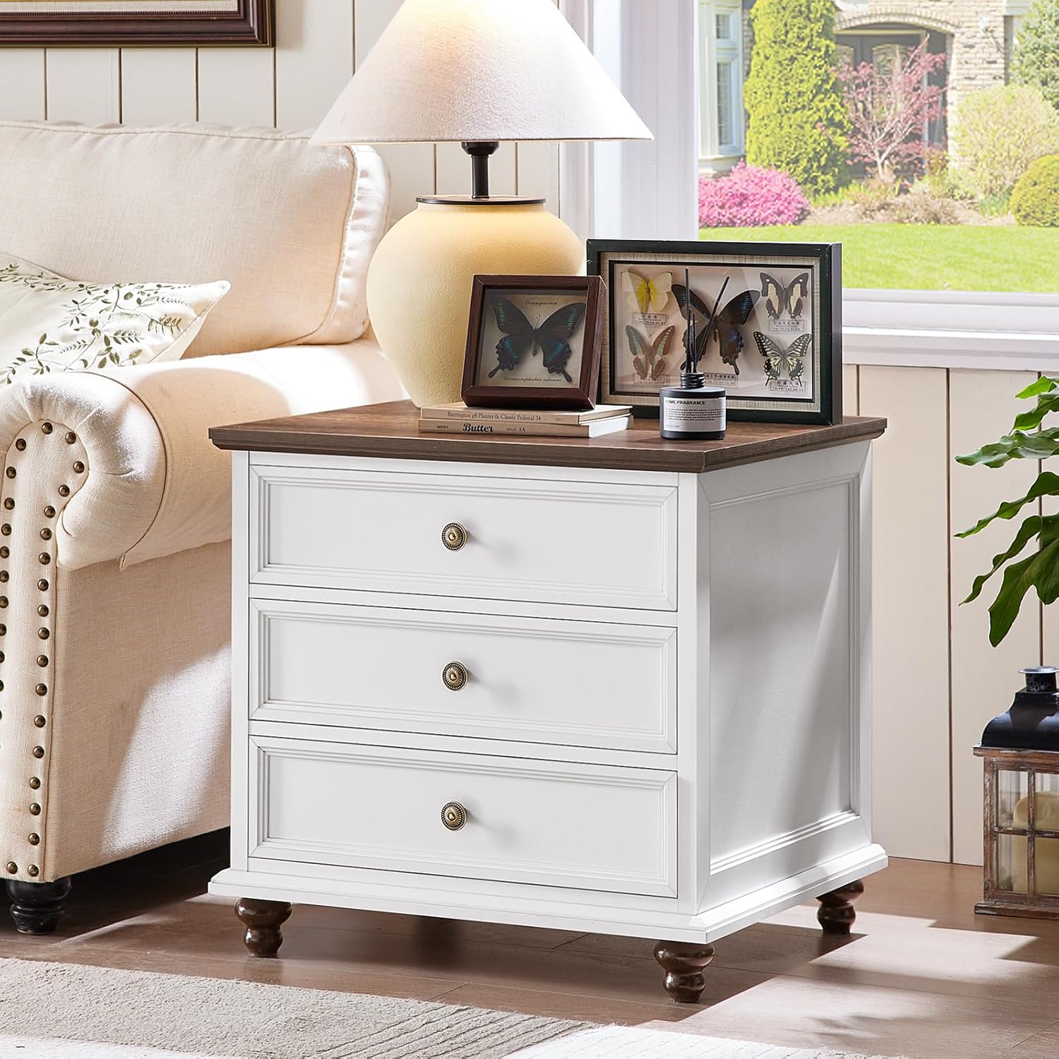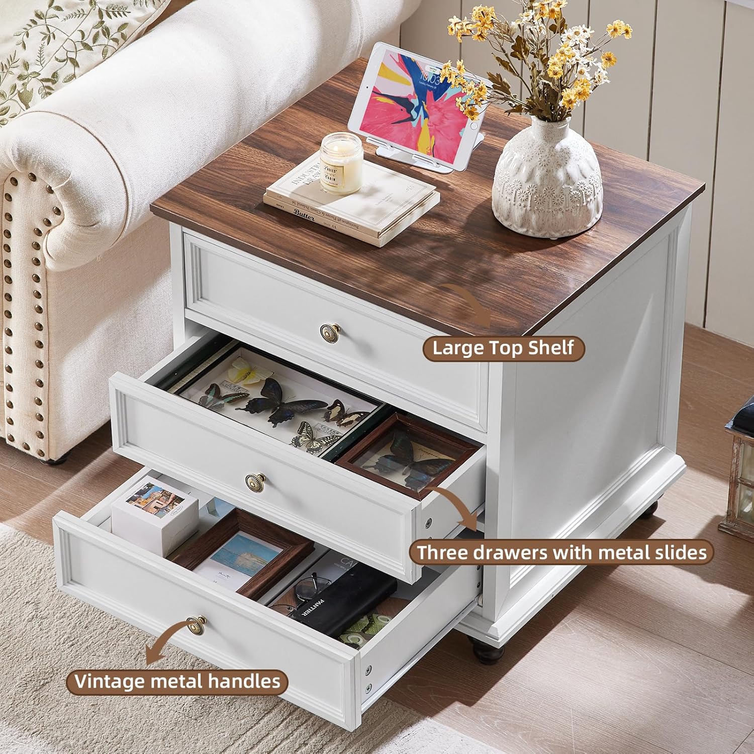 24" Wide Farmhouse Night Stand,Large End Table with 3 Drawers & Metal Handle,White Wood Dresser for Bedroom Cabinet, Bed Side Tabl·e Chest of Drawers,Nightstand for Living Room,Close