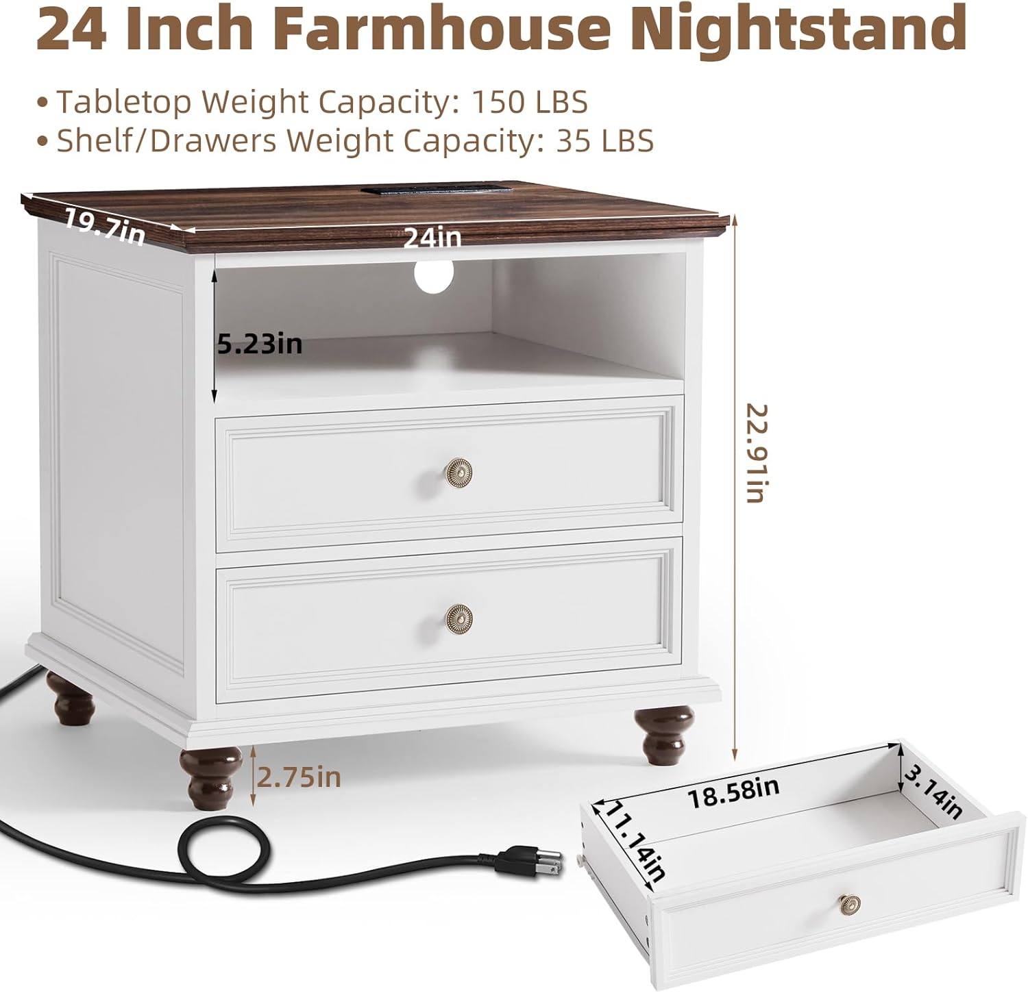 24" Wide Farmhouse Nightstand with Charging Station, End Table with 2 Drawers, White Wood Dresser for Bedroom Cabinet, Bed Side Table Chest of Drawers, Night Stand for Living Room, Closet