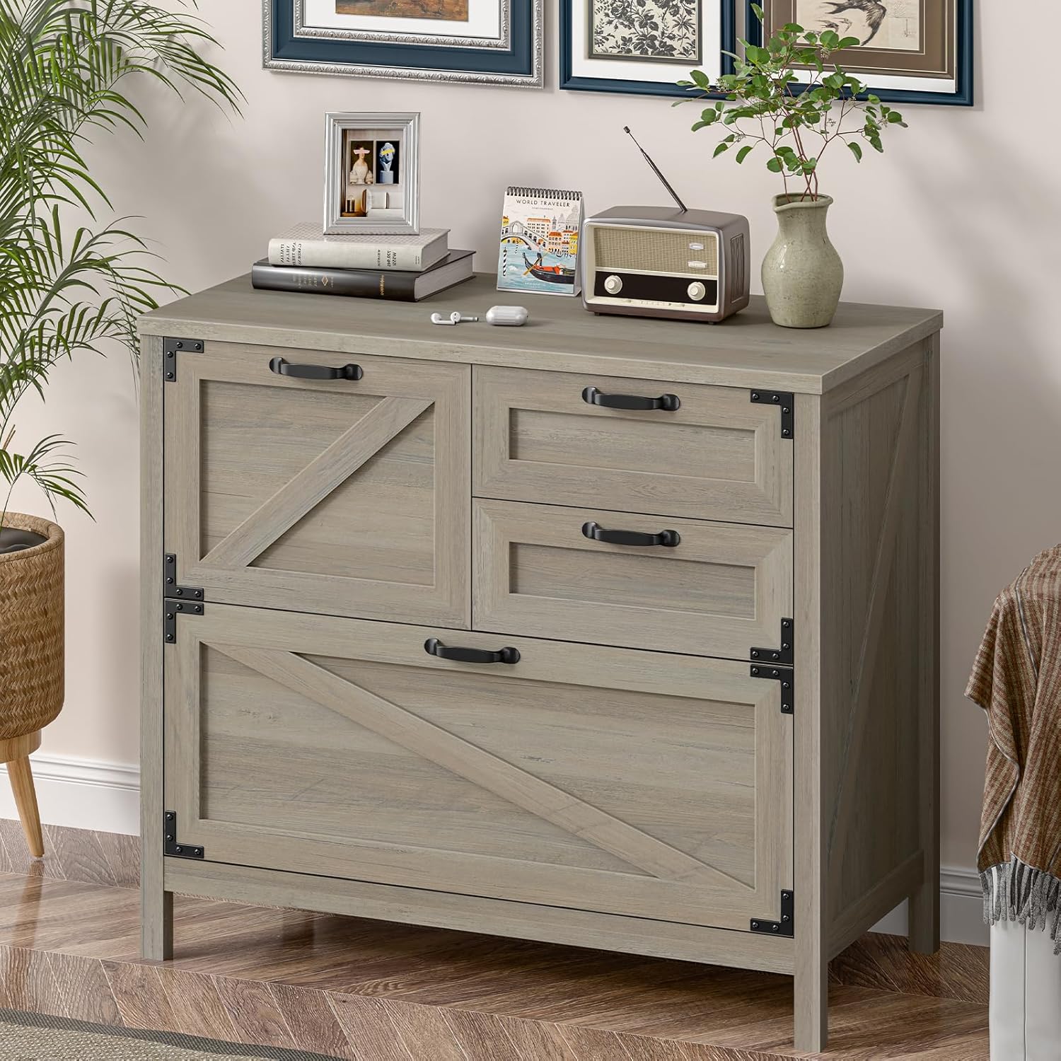 Wood Lateral File Cabinet with 4-Drawer for Hanging Files Letter/A4/Legal Size, Large Farmhouse Filing Cabinets for Home Office, Printer Stand with Office Cabinet, Office Furniture, Rustic Grey