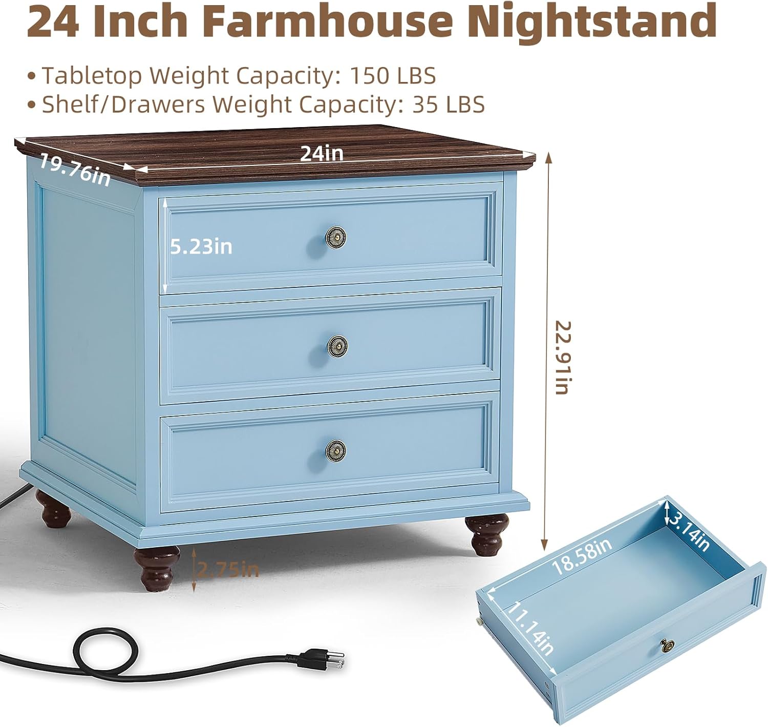 24" Wide Farmhouse Night Stand,Large End Table with 3 Drawers & Metal Handle,Light Blue Wood Dresser for Bedroom Cabinet, Bed Side Tabl·e Chest of Drawers,Nightstand for Living Room,Close