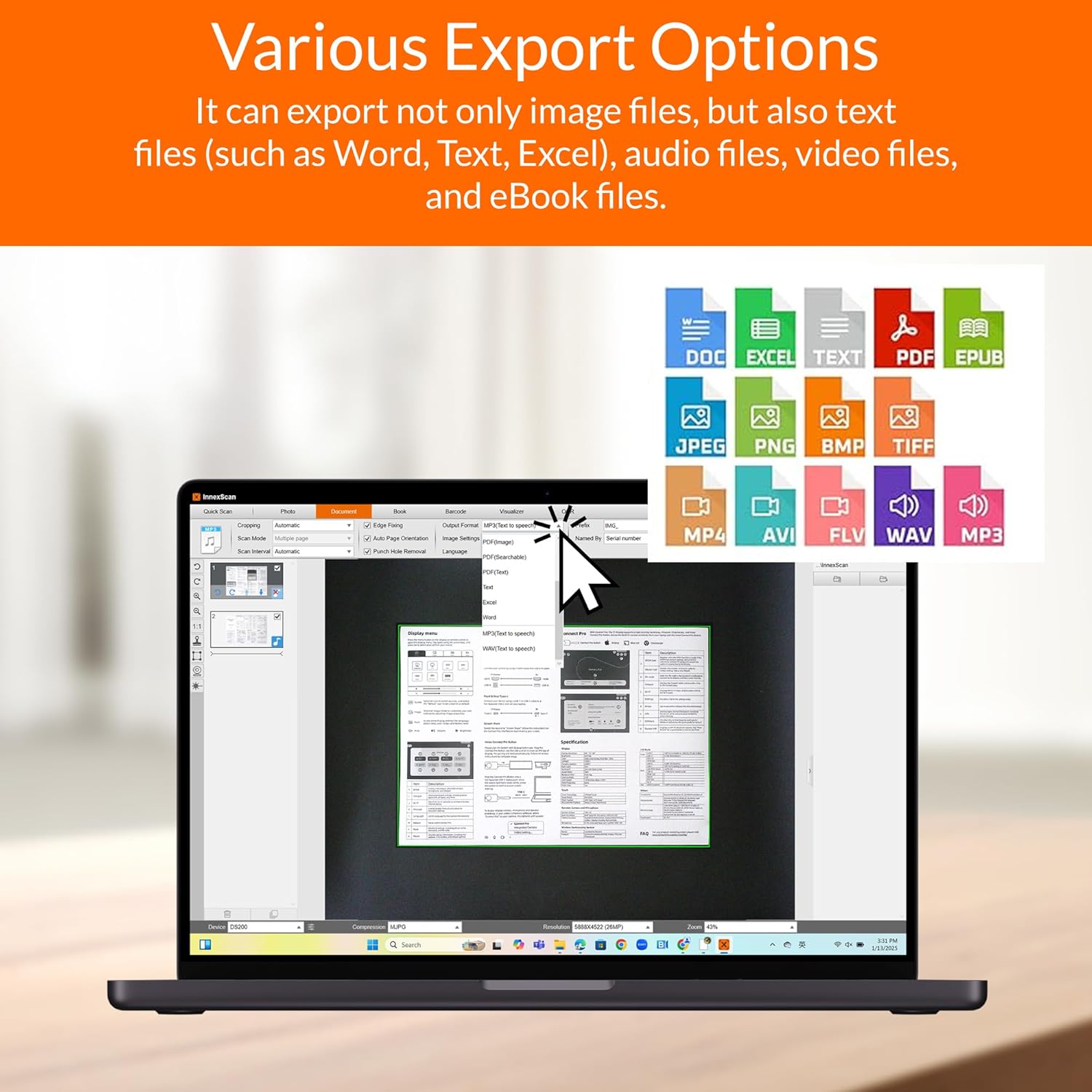 Innex DS200 Professional USB Book Scanner, 26MP, A3 Document scan, 120+ Language OCR, Auto-Flatten & Deskew, Finger Removal, Built-in Mic and LED lamp, Hand Button & Foot Pedal, for Windows/MacOS