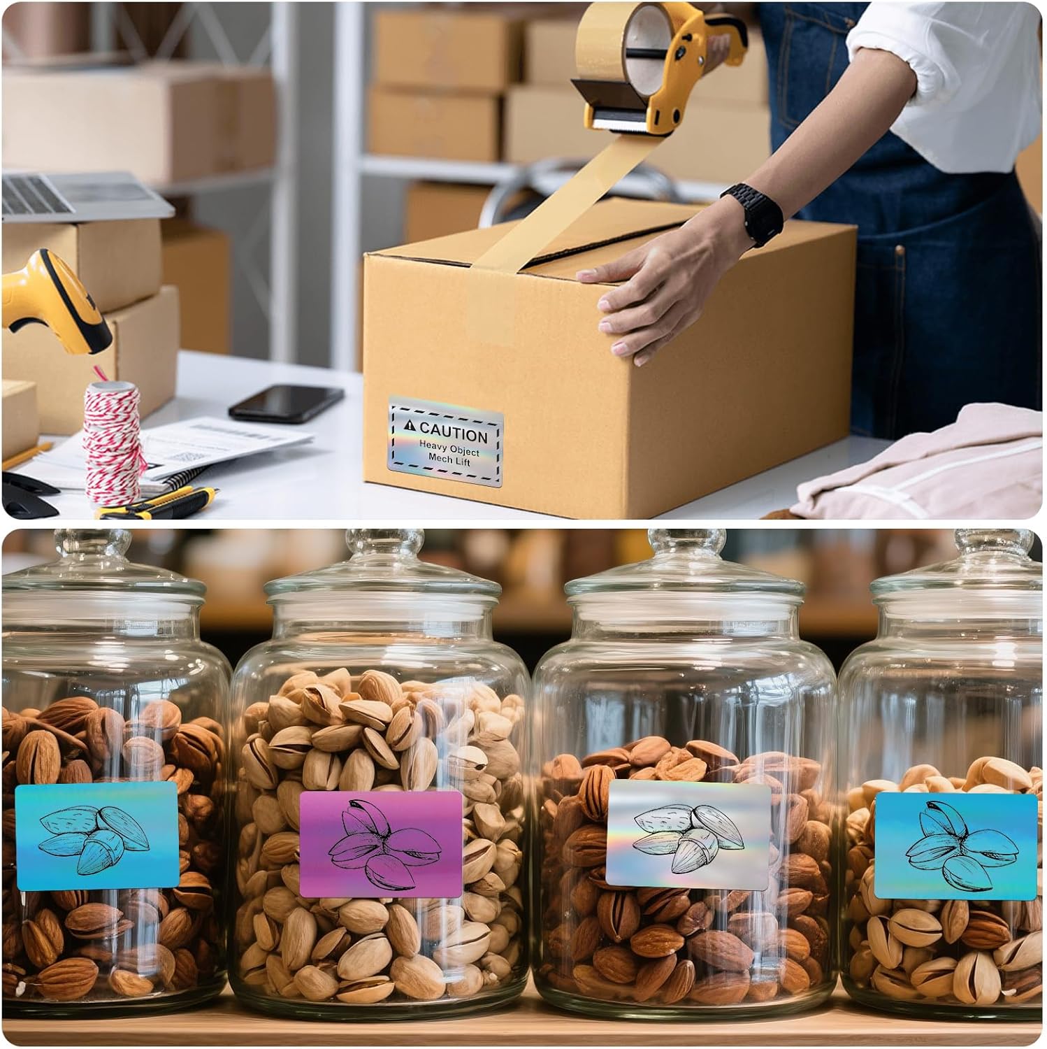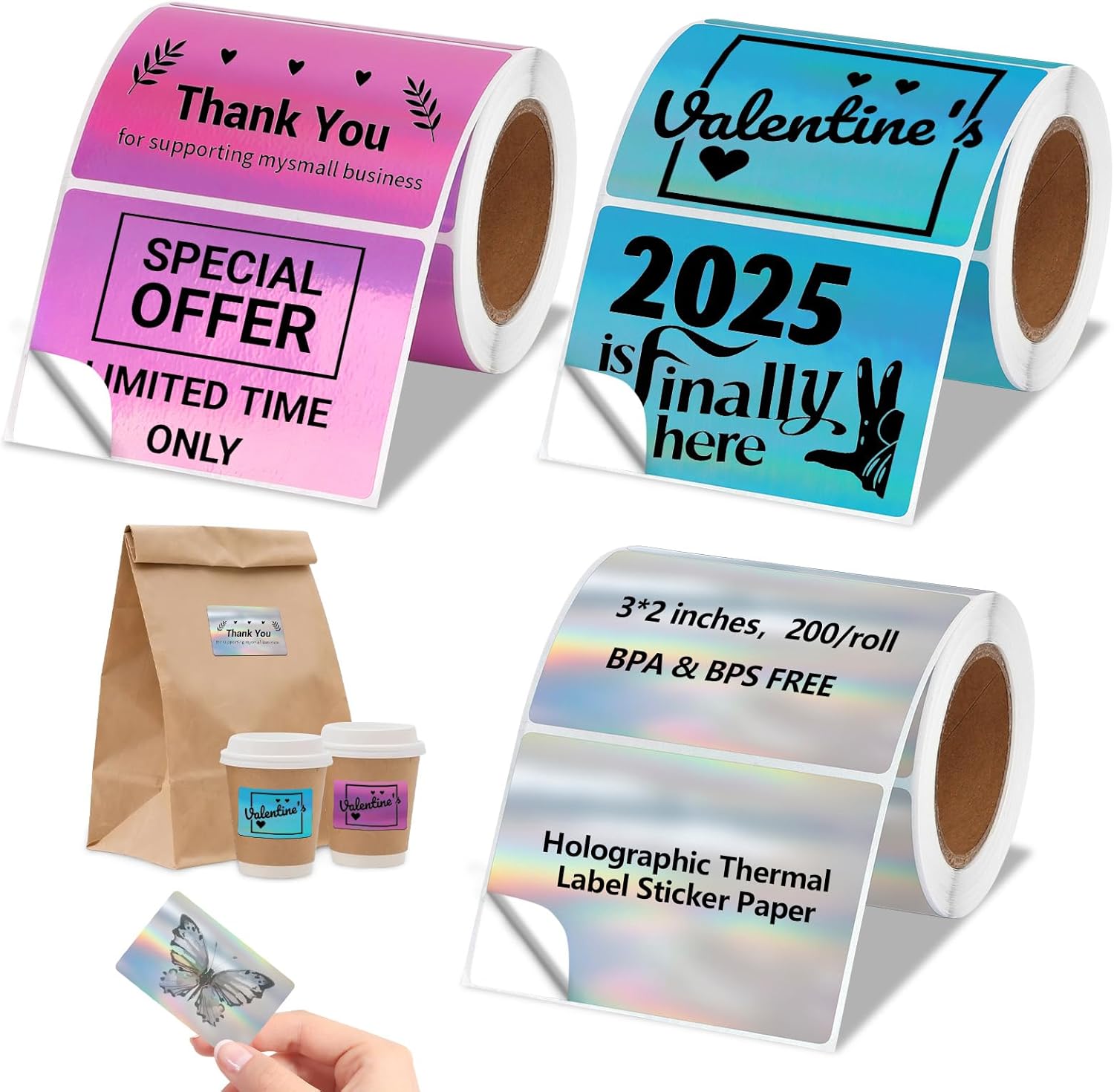 - Holographic Rainbow Glitter Labels: Our holographic laser thermal labels are available in 3 rolls of silver, pink and blue colors, 200/roll, a total of 600 labels, Size: 3x2 inches.Colorful metallic vinyl surface gives printed labels a gradient color as light passes through the label, enhancing package appeal and recognition. Square gradient labels can be imprinted with a variety of different text and graphics to make your products more unique and eye-catching.