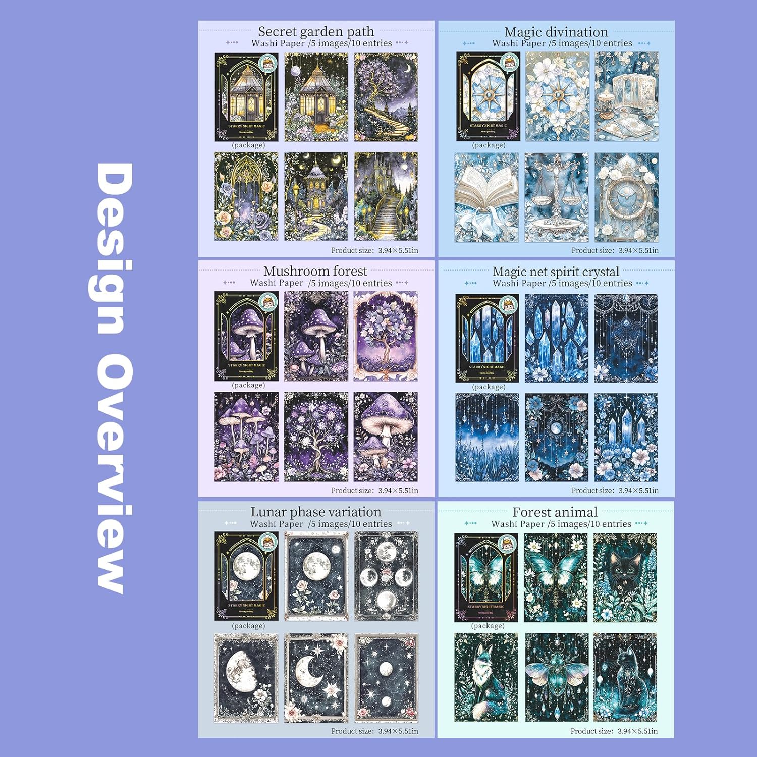 - Fantasy-Inspired Design: This sticker set includes 6 magical themes, each with 5 unique designs and 10 pieces in total, for a total of 60 washi paper stickers. The dreamy starry night aesthetic adds a whimsical touch to your scrapbook, journal, or planner