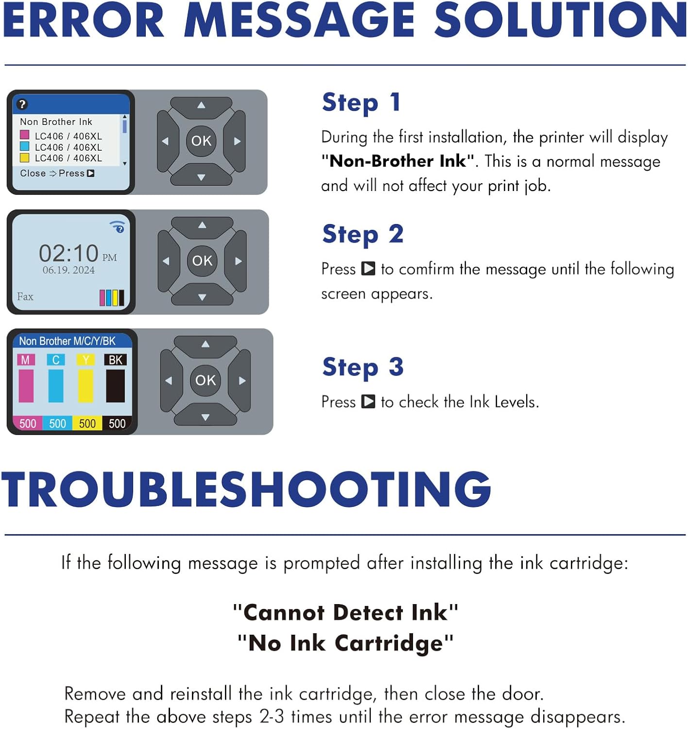 - Installation Tips: [1].Don't remove or touch the CHIP.[2]. When the printer prompts "non-original", please click OK or Next to continue. [3].When the printer appears "low ink", "empty", "replace ink cartridge" and other prompts, please remove the ink cartridge and reinstall it several times