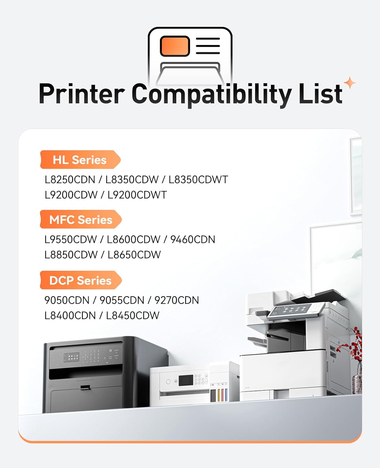 - Compatible Printers: Compatible with Brother DCP-9050CDN,DCP-9055CDN,DCP-9270CDN,DCP-L8400CDN,DCP-L8450CDW Series Printer; HL-L8250CDN,HL-L8350CDW,HL-L8350CDWT,HL-L9200CDW,HL-L9200CDWT Series Printer; MFC-L9550CDW,MFC-L8600CDW,MFC-9460CDN,MFC-L8850CDW,MFC-L8650CDW Series Printer.