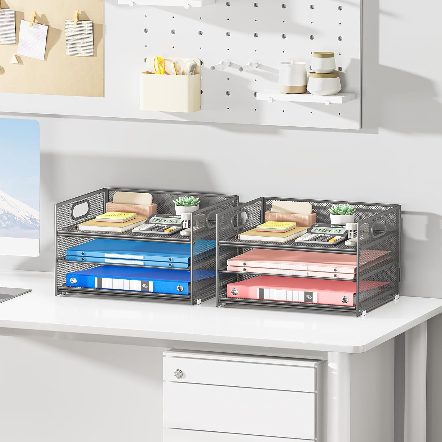 Subekyu 2-Pack 3-Tier Gray Metal Mesh Desk Paper Letter Tray & File Sorter Organizer with Handle + 1 Sliding Tray for Desk, Home, Office, School Supplies, A4 Paper and Accessories Storage