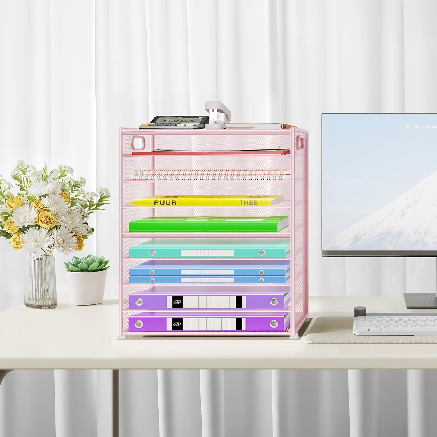 9 Tier Paper Organizer with Handle, Large Capacity Desk Organizer Mesh Paper Letter Tray File Folder Document Sorter for Classroom and Office Accessories Organization- Pink (2 Pack)