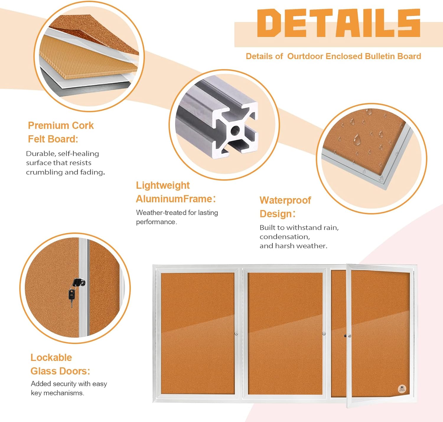 - Weatherproof Enclosed Bulletin Board with Glass Door - Our enclosed bulletin board features a tempered glass door, constructed with premium materials such as natutal corkboard pin surface and aluminium-plastic composite panel.