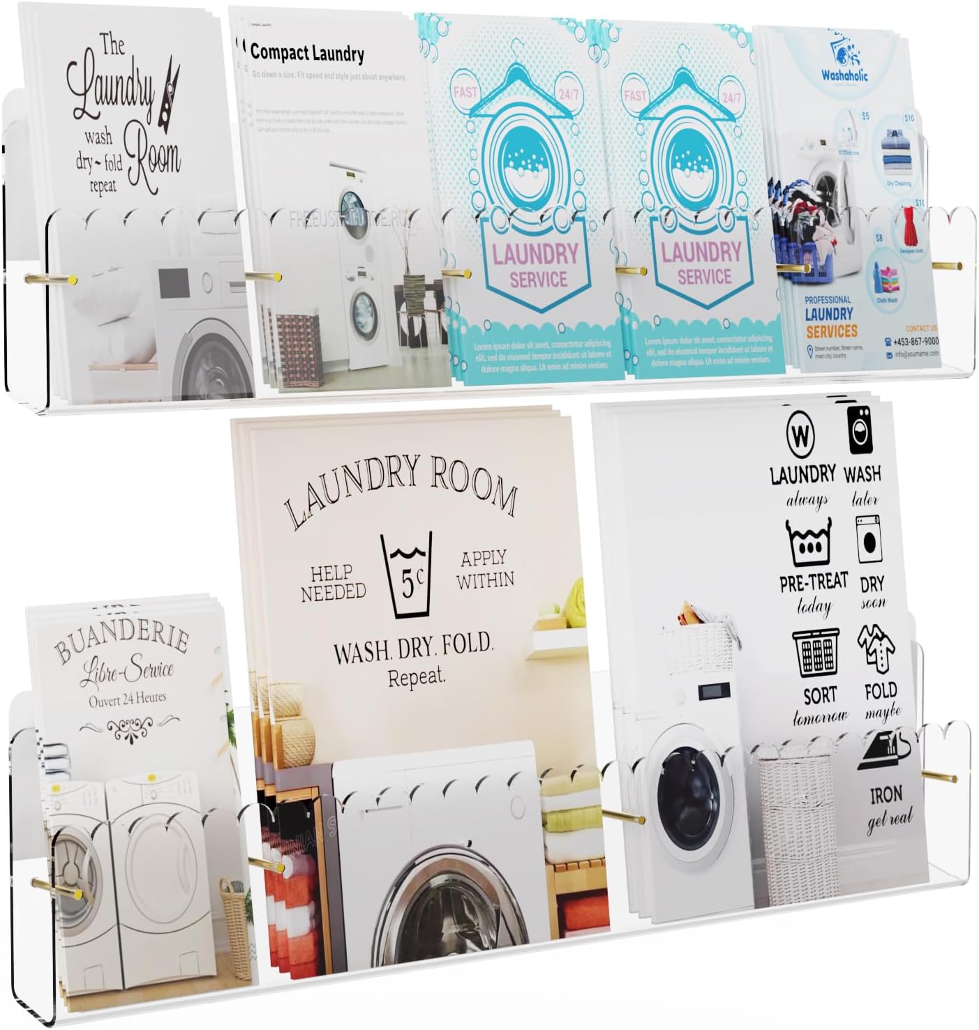 Brochure Holder Wall Mount, 2 Pack Acrylic Modular Flyer with Adjustable Magnetic Golden Bolt, Wavy Lace Pamphlet Display Stand for Organizer Trifold Flyer, Document, Leaflet, 5 Slots