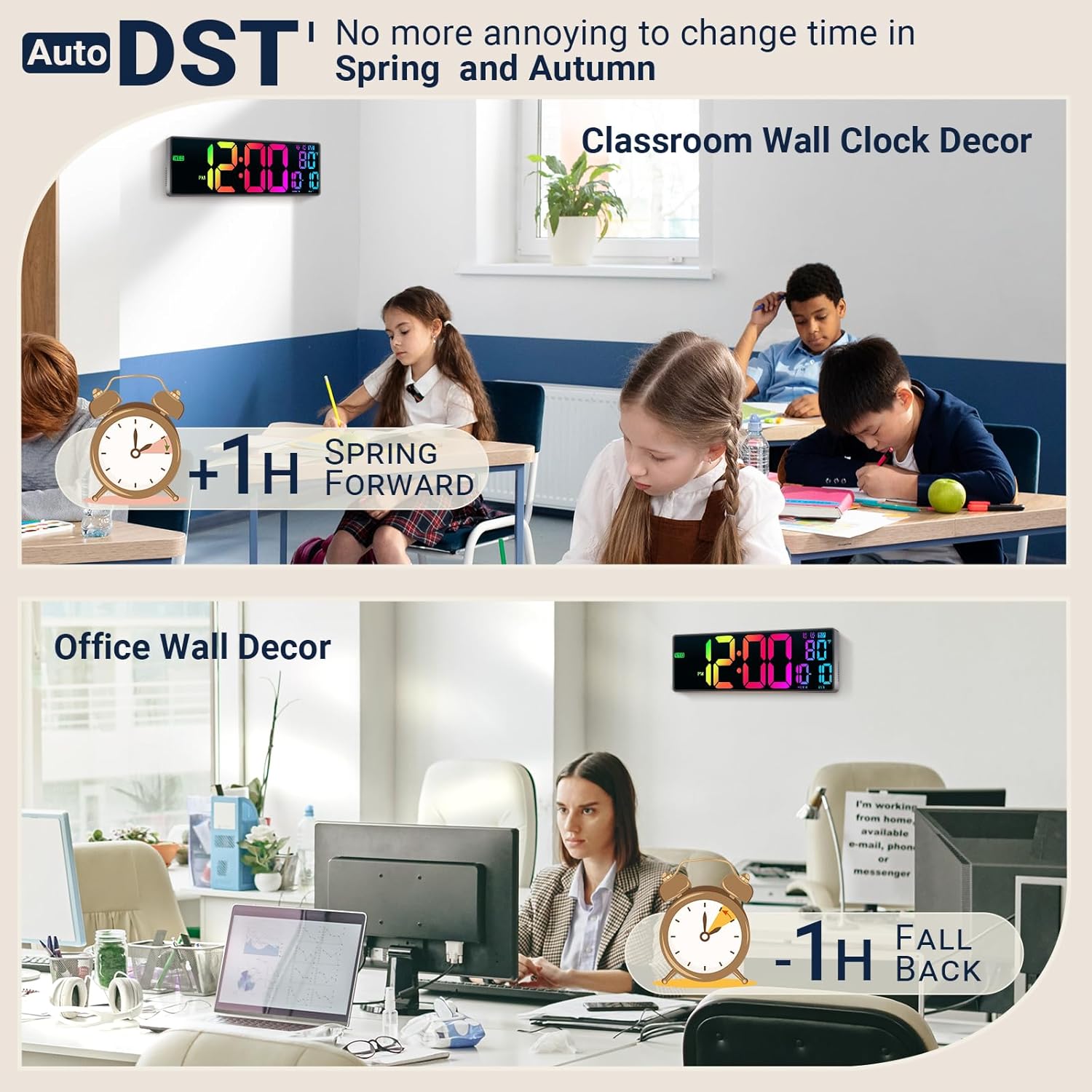 - Auto DST and Auto Brightness: It will automatically switch between DST time in March and November. You'll never have to remember to change the time again. Additionally, a built-in light sensor adjusts the display brightness automatically for comfortable viewing at any time. CΒ° and FΒ° are adjustable
