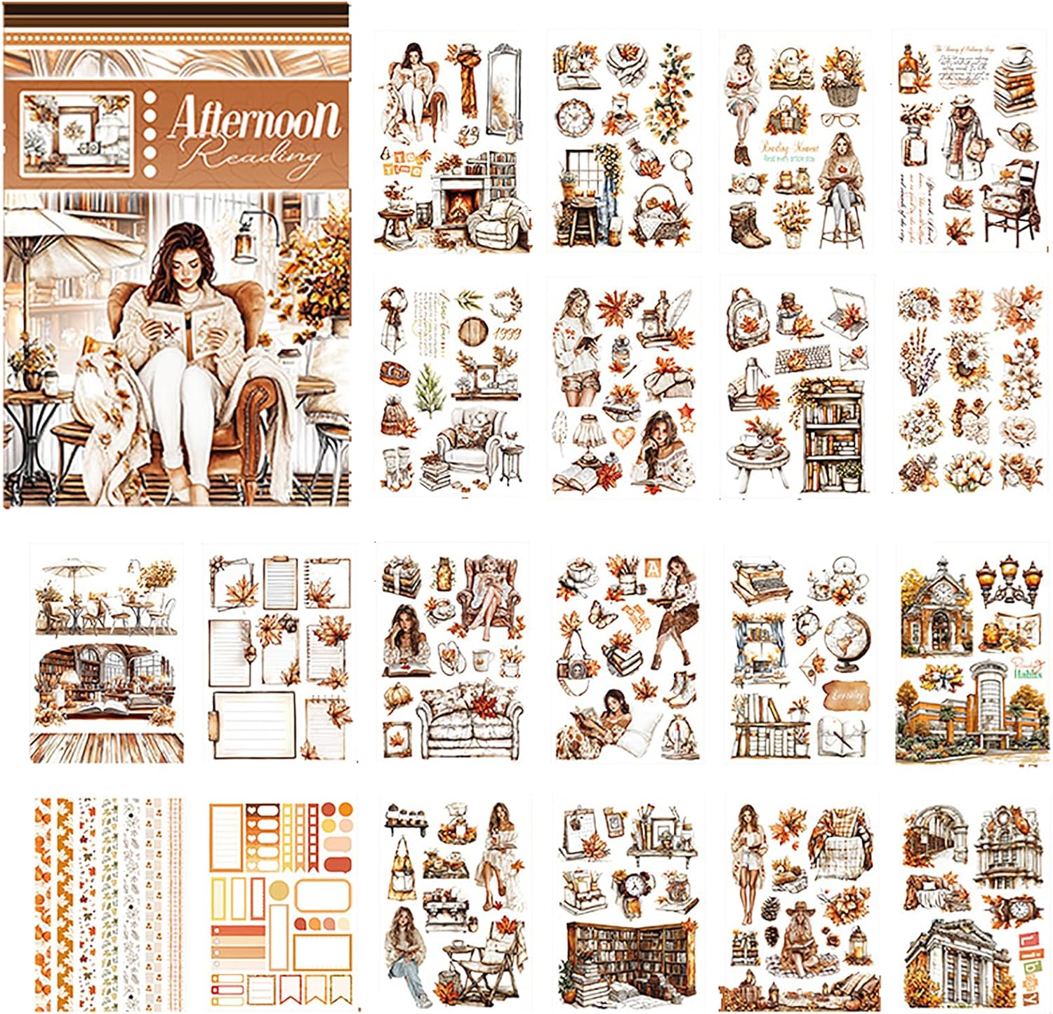 - The Reading Girls scrapbook stickers are pre-cut and ready to use. Each sticker features stylish designs, including a reading girl, maple leaf, bookshelf, book, flower, sofa, house, and label. They are ideal for embellishing scrapbooks, journals, and other crafts.
