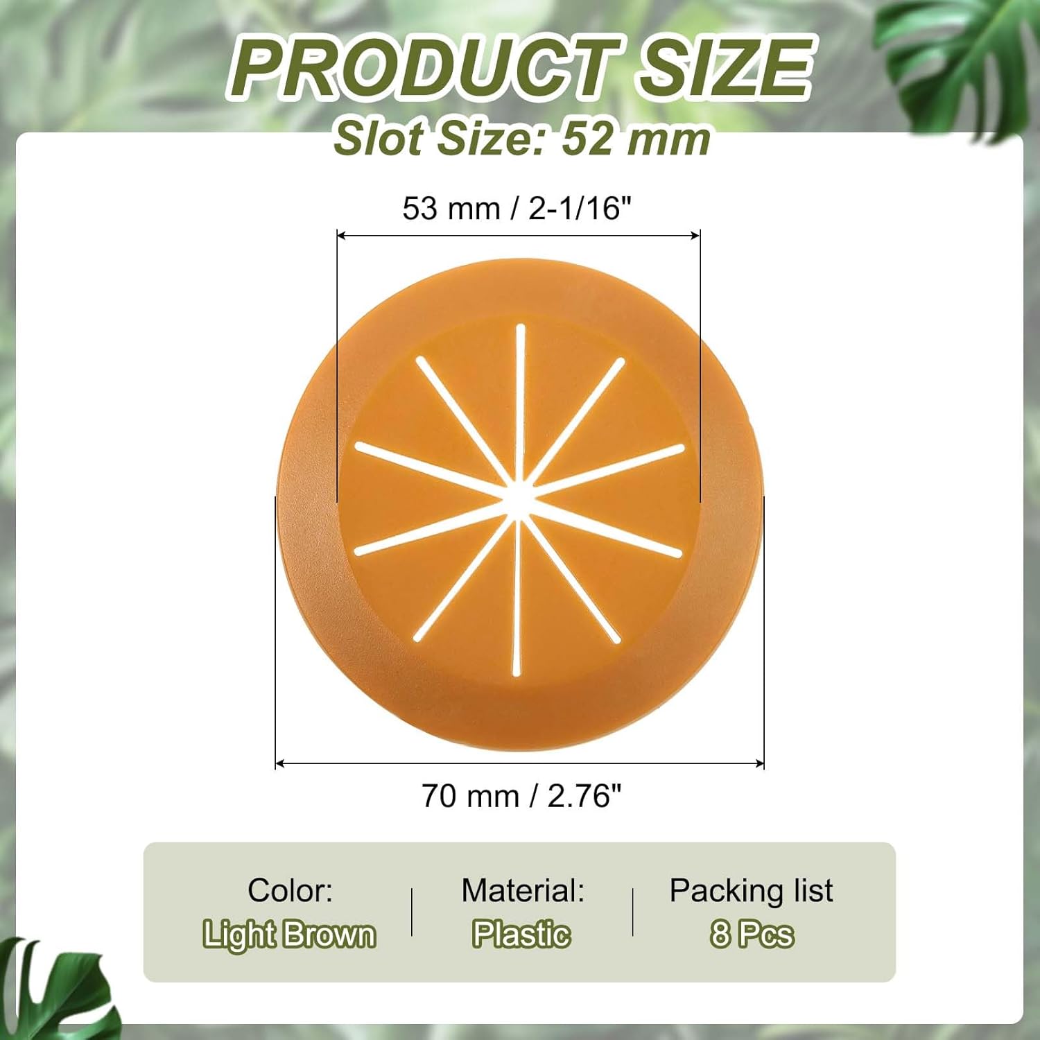 - Color: Light Brown; Material: Plastic; Inner Diameter: 53 mm / 2-1/16"; Slot Size: 52 mm / 2.05 inch; Total Size: 70 mm / 2.76 inch; Packing List: 8 Pcs x Desk Grommet