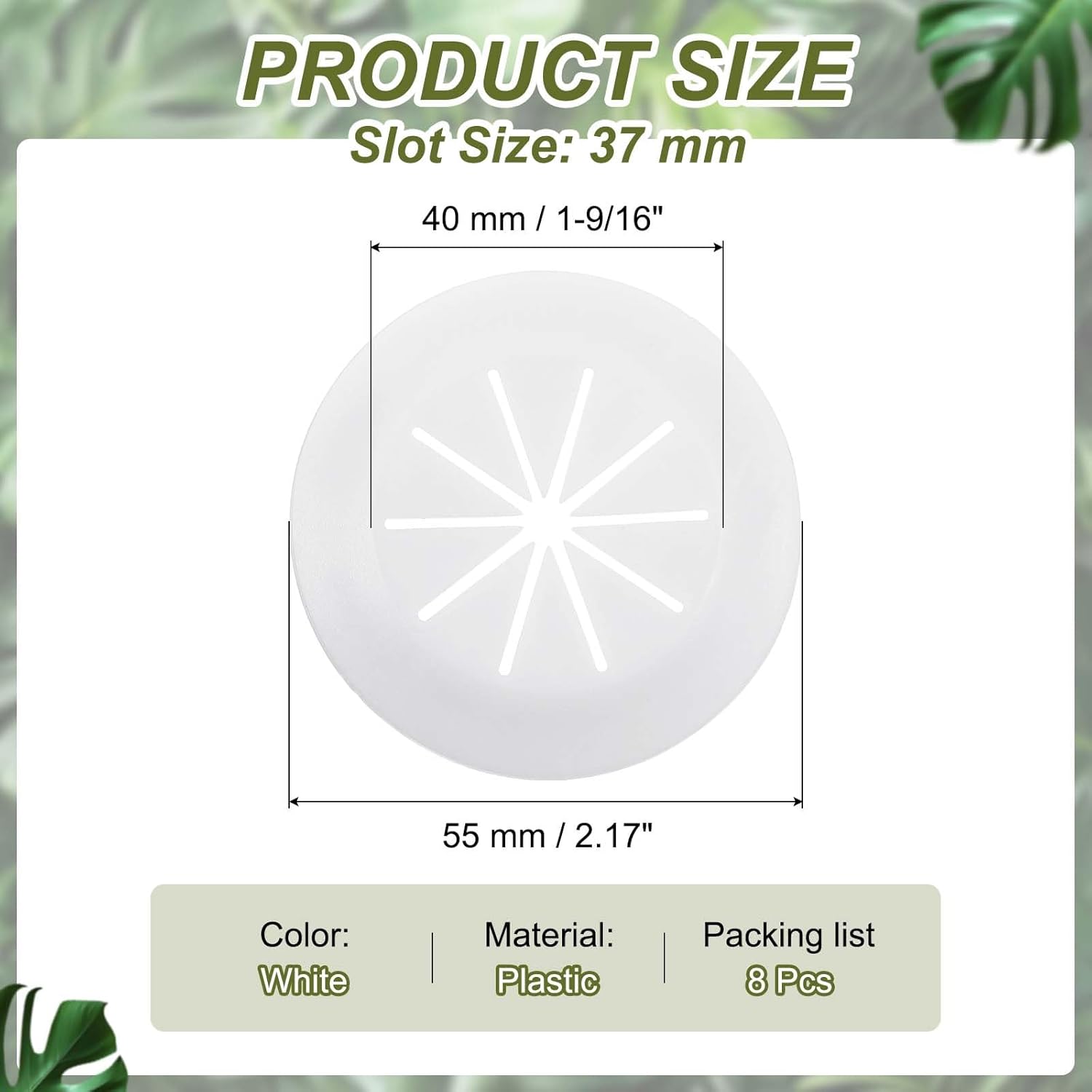 - Color: White; Material: Plastic; Inner Diameter: 40 mm / 1-9/16"; Slot Size: 37 mm / 1.46 inch; Total Size: 55 mm / 2.17 inch; Packing List: 8 Pcs x Desk Grommet