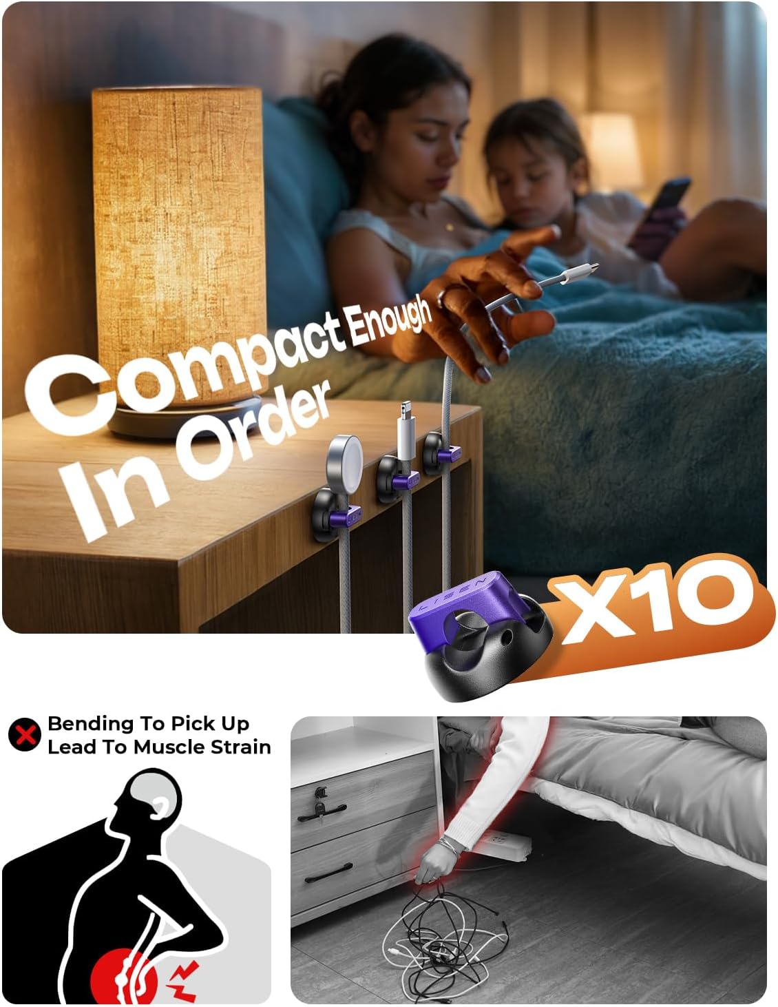 10-Pack Magnetic Cable Clips [1S Snap-On] Cord Holder, LISEN Office Desk Organizers and Accessories with 5 Extra Strong Adhesive Pads, Wire Organizer for Nightstand, Home, Wall, Car, Desktop, Purple