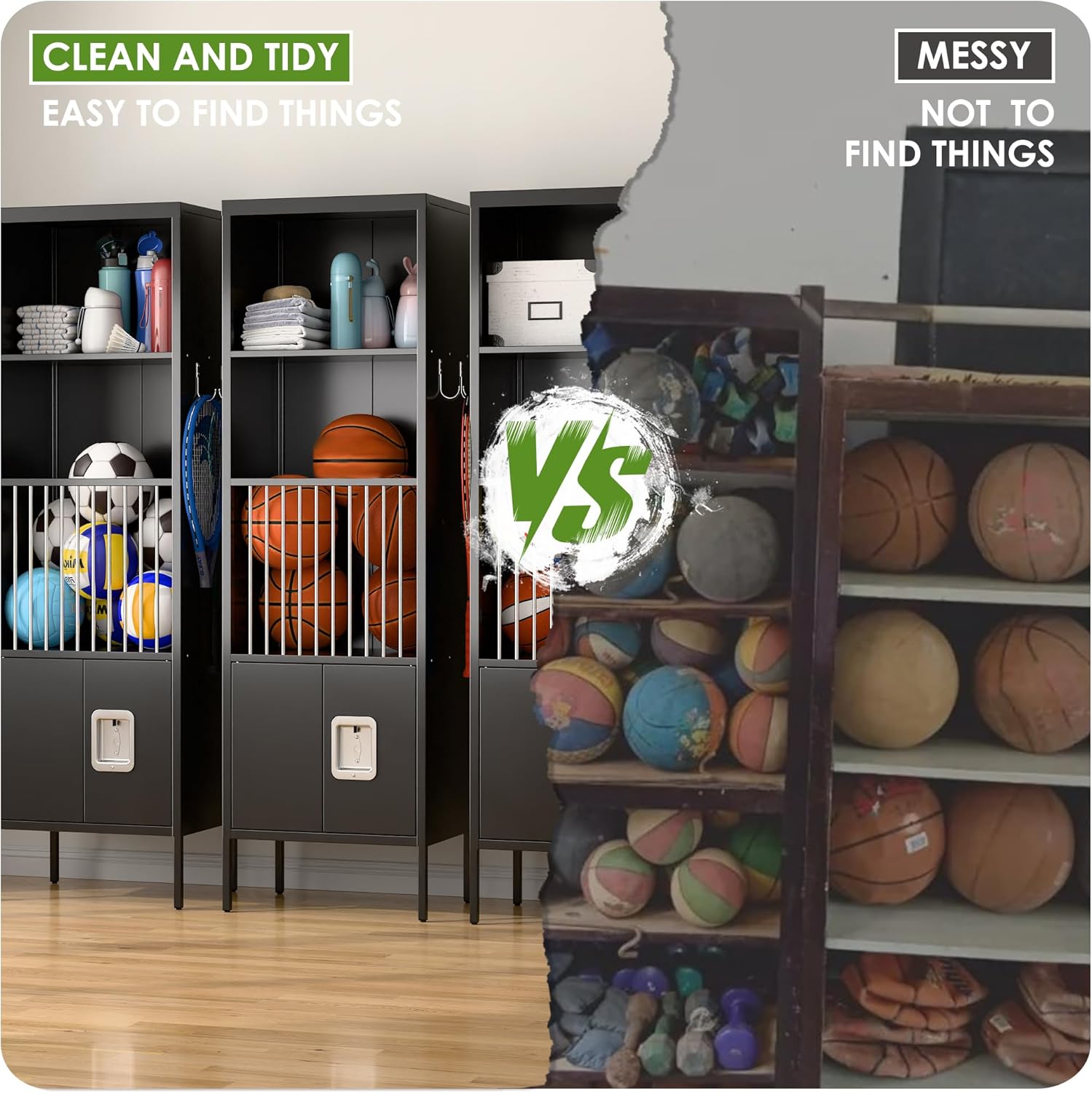 - Convenient Design: Spacious open compartments can storage access to water cups, towels and other items. High feet of lcoker to avoid moisture or put your shoes under your locker, can storage your sports balls inside the railings to avoid losing them and store essentials in the space inside the lockable door