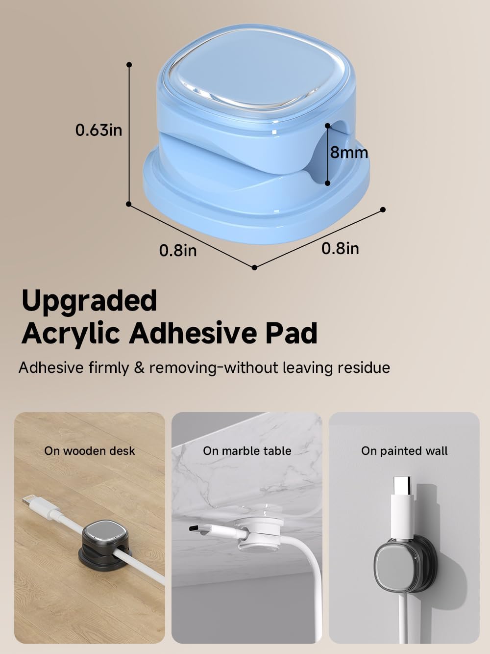 - No-Residue Acrylic Adhesive : Unlike ordinary adhesive tapes, our cable holder organizer utilizes the acrylic adhesive that is stronger and leaves no residue and won't damage your desk / nightstand or walls when removed. Just simply stick the wire holder organizer to any smooth and dry surface, such as wooden table, glass, or ceramic tiles, etc