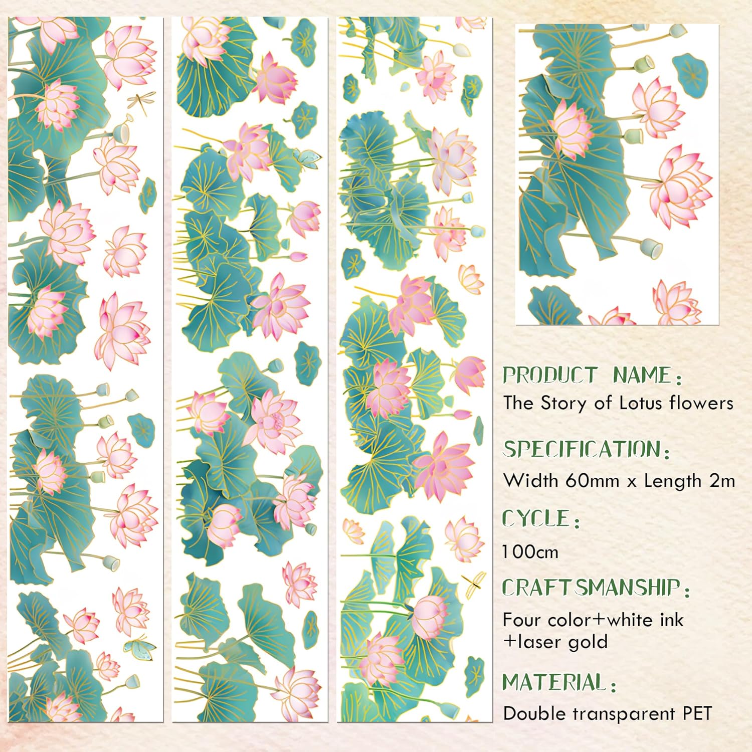 - Elegant Lotus Design Tape: This PET tape features a stunning assortment of pink lotus flowers and lush green leaves, bringing a serene and artistic flair to your creative projects