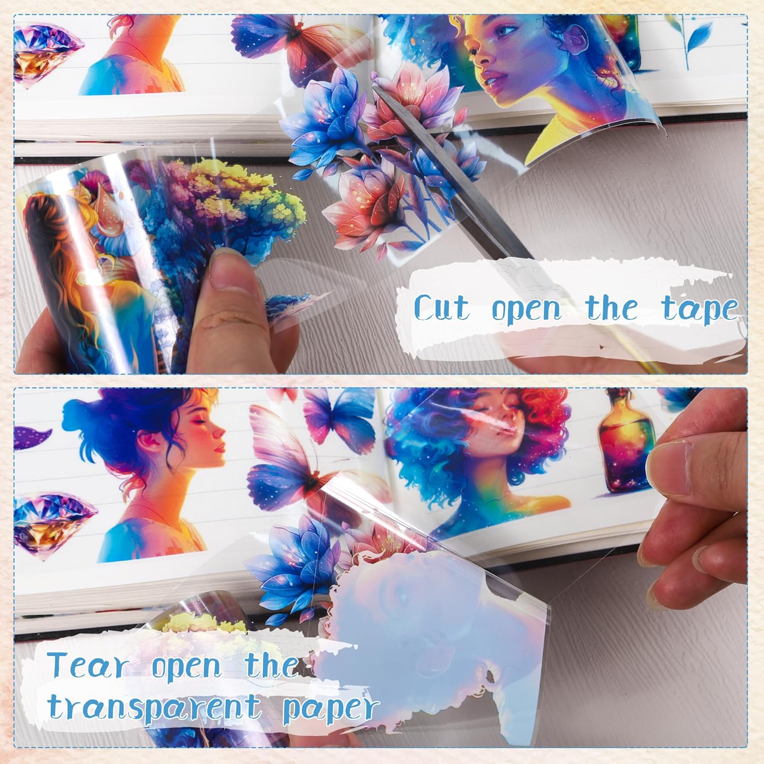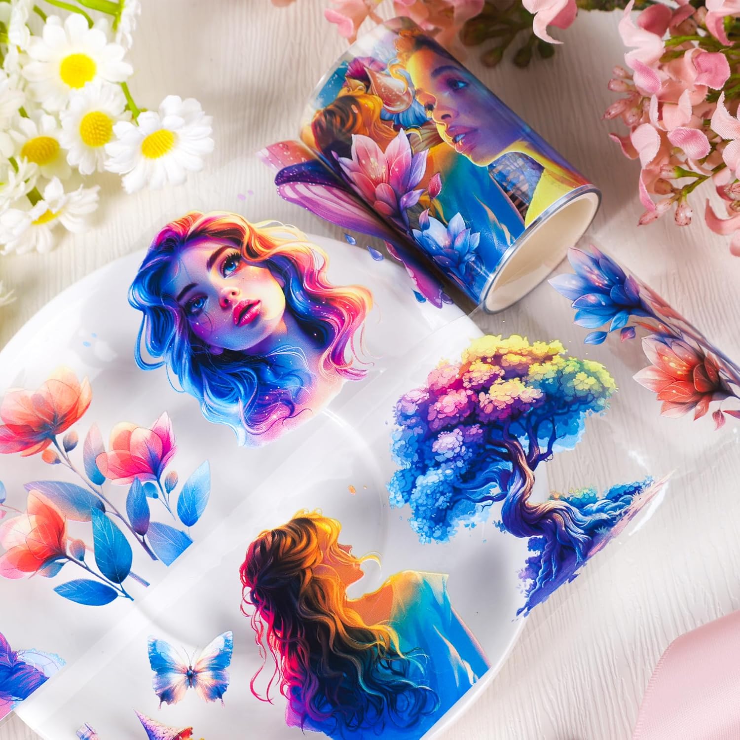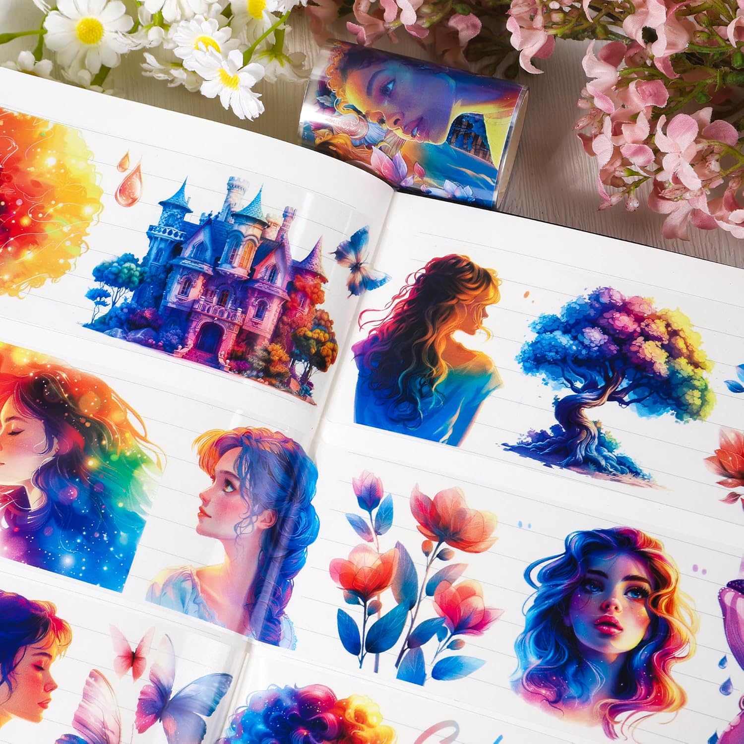 - Vibrant Design Scrapbook Tape: This PET tape showcases a stunning array of colorful illustrations, including enchanting characters, flowers, and vivid landscapes, adding a magical touch to your projects