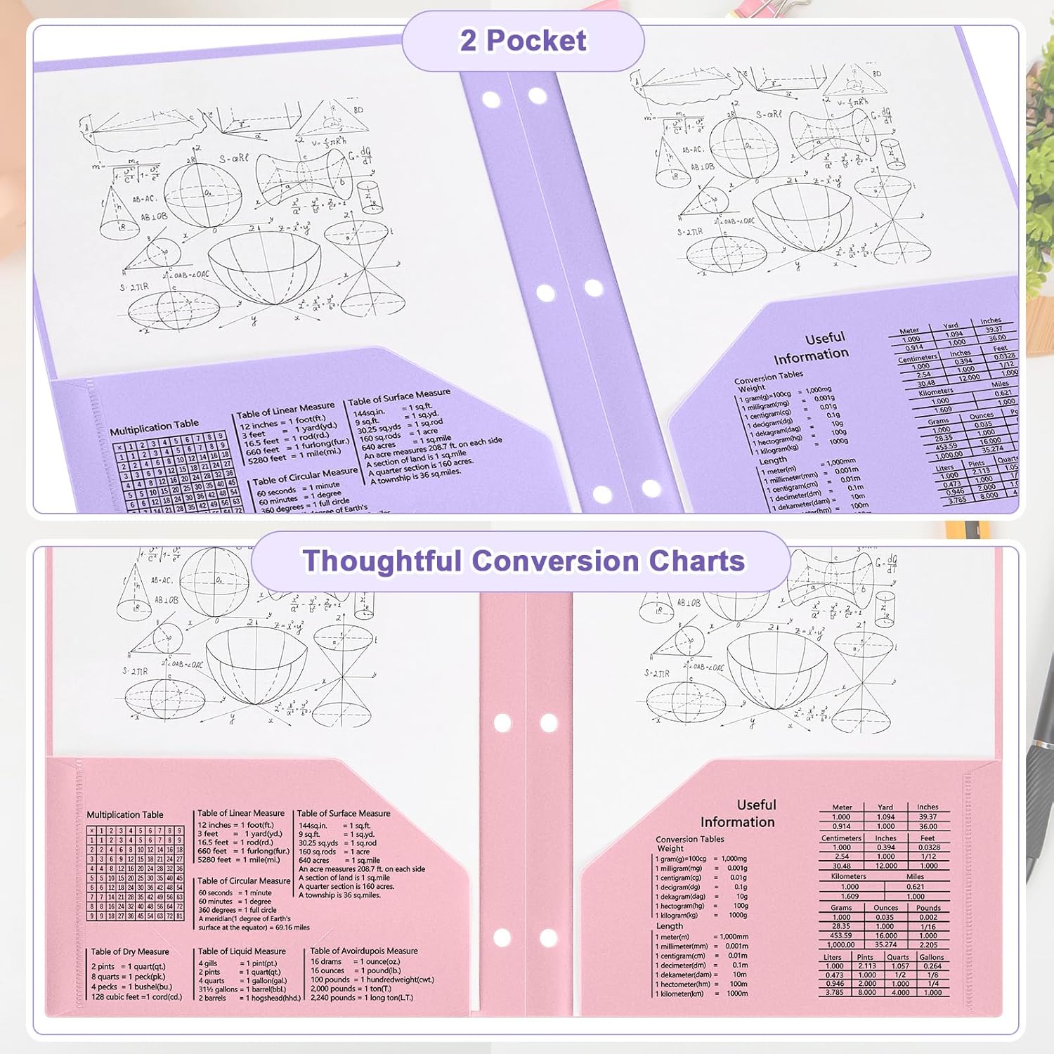 - Enough Quantity for Use and Replacement: you will receive 12 plastic pocket folders, each folder has 3 holes and 2 inside pockets, each folder pocket contains creative designed calculation conversion tables, help you quickly solve simple math problems; Can hold 3 binders and 8.5 X 11 inch letter-sized paper, each pocket can easily and neatly stack 50 pages of letter-sized paper