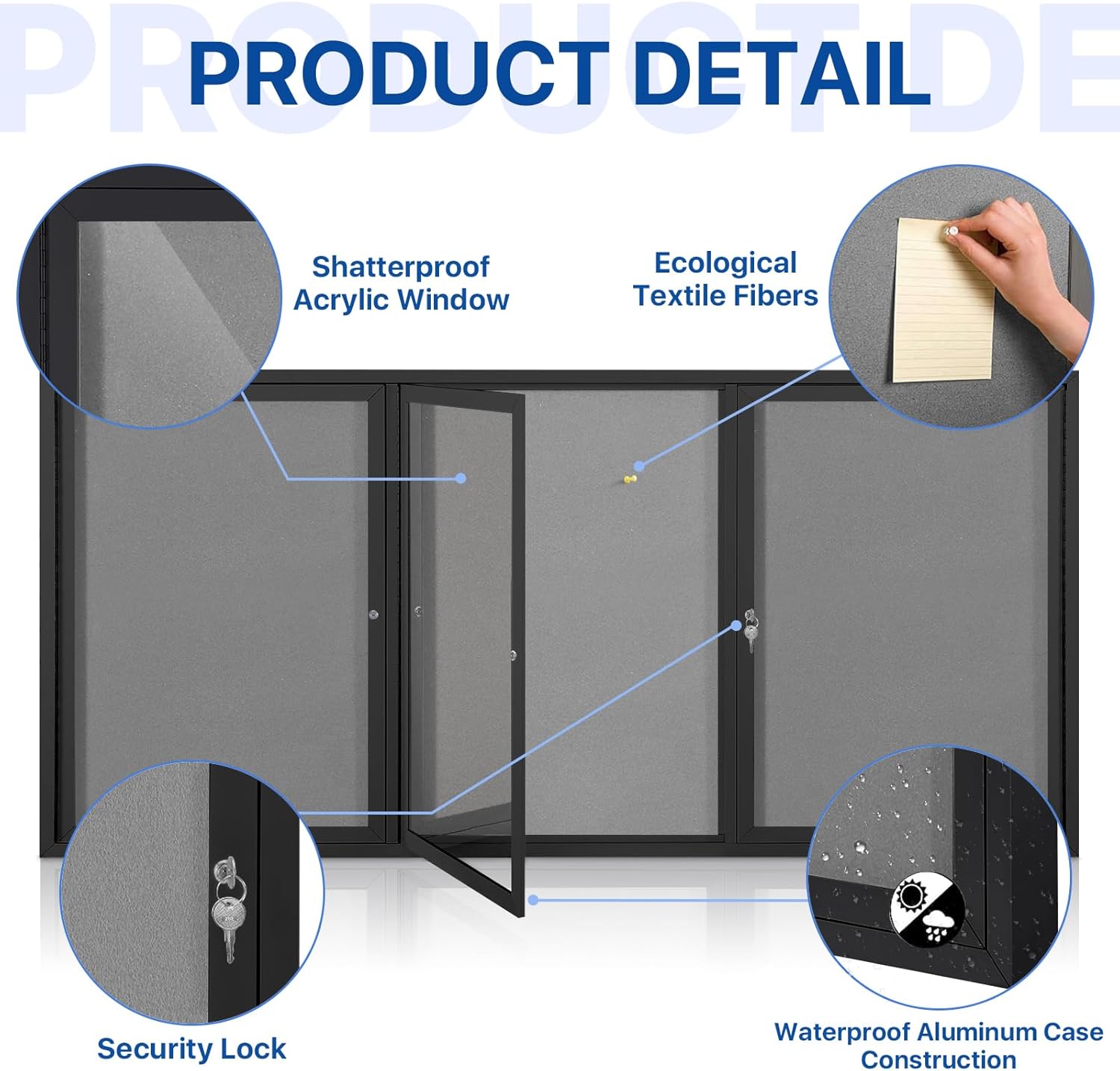 SWANCROWN Outdoor Bulletin Board 70x36in, Enclosed Bulletin Board with Locking Door for Office School Commerce, Grey Felt, Black Aluminum Frame