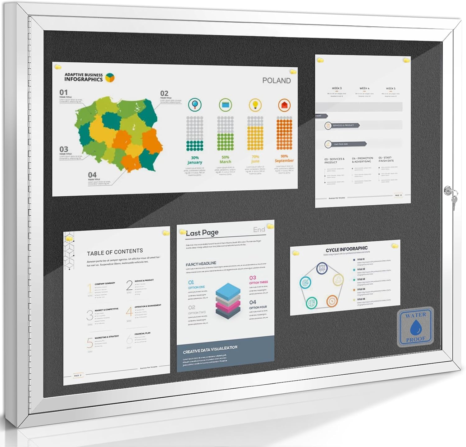 SWANCROWN Enclosed Bulletin Board Weatherproof 37x28in, Outdoor Lockable Bulletin Board Wall Display Case for Office School Commerce, Black Felt, Sliver Aluminum Frame (8xA4)