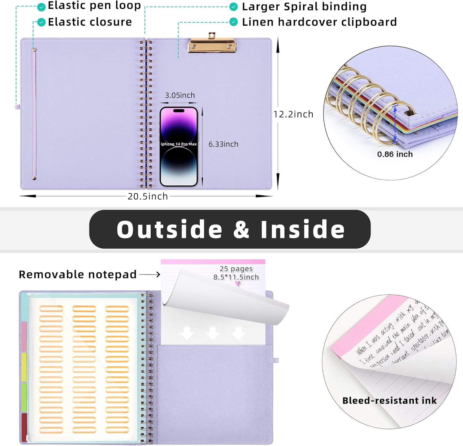 Ospelelf Foldable Spiral Clipboard Folio with Storage Zipper Pouch, 5 Plastic Folders with 10 Pockets, Refillable Lined Notepad (11" x 8.5"), Linen Hardcover Project Organizer (Light Purple)