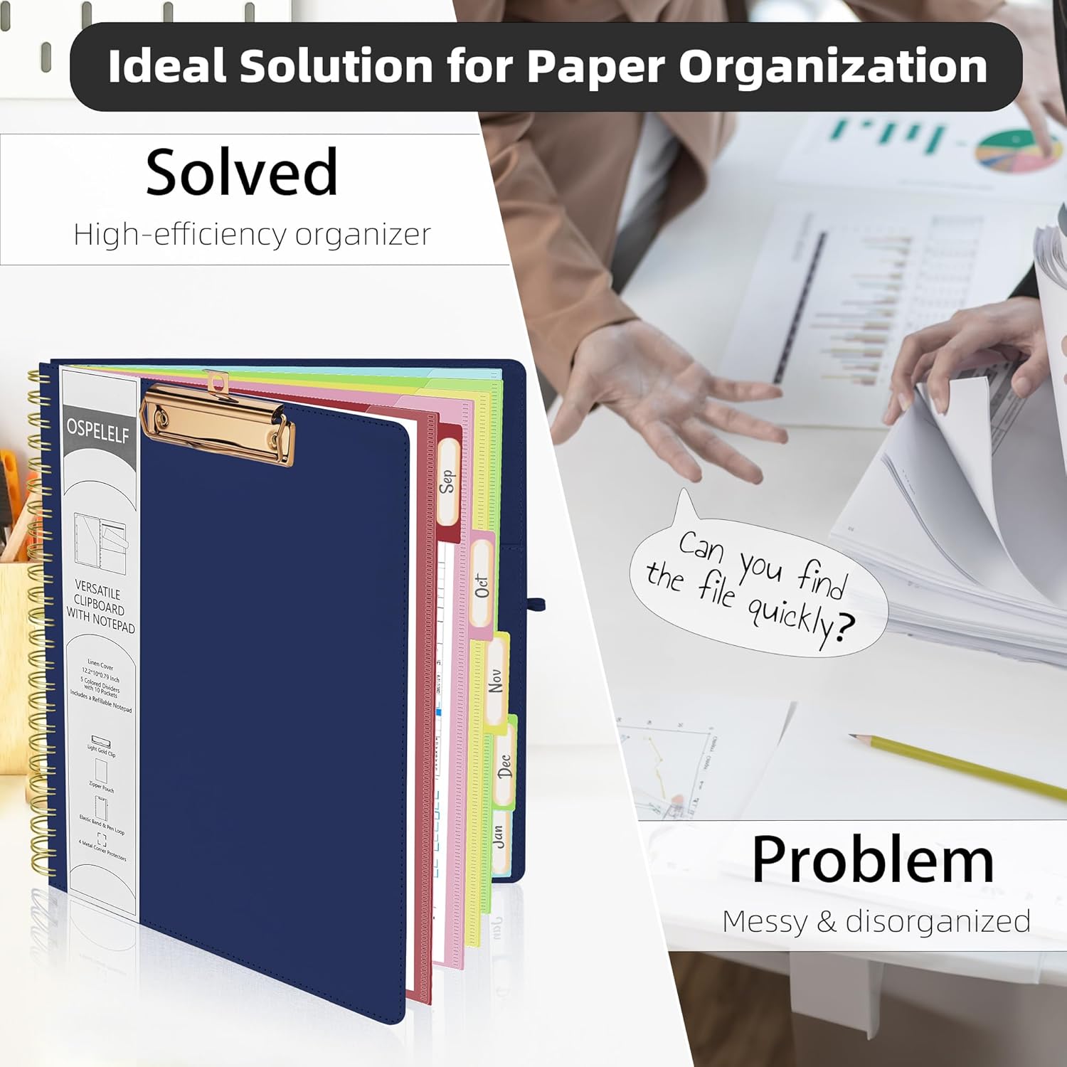 - 【Premium Materials】Unlike other flimsy folders, it features a sturdy metal clip with gripping, double screw coil, and reinforced corners to prevent document damage. The PP folder, PVC pouch, elastic pen loop and closure keep everything organized and secure, avoiding tears, breaks, and lost accessories. The removable notepad with 25 pages won't bleed ink. Our clipboard folio is designed to address common issues found in low-quality organizers.