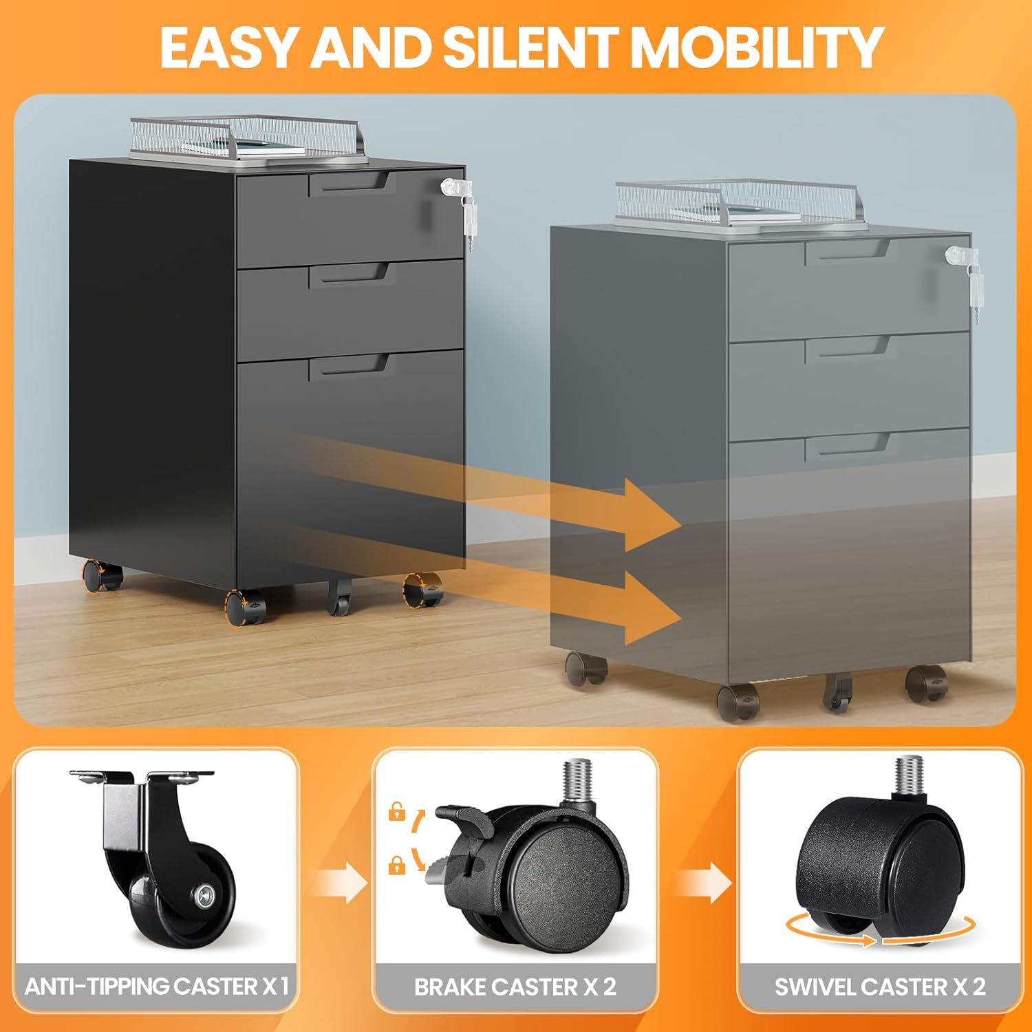- 【Safe Locking System】▶▶ 1 lock secures all three drawers, the fully assembled mobile file cabinet comes with 2 keys for your locking ,Anti-tilt mechanism allows only one drawer to open at the same time to prevent the cabinet from tipping forward.