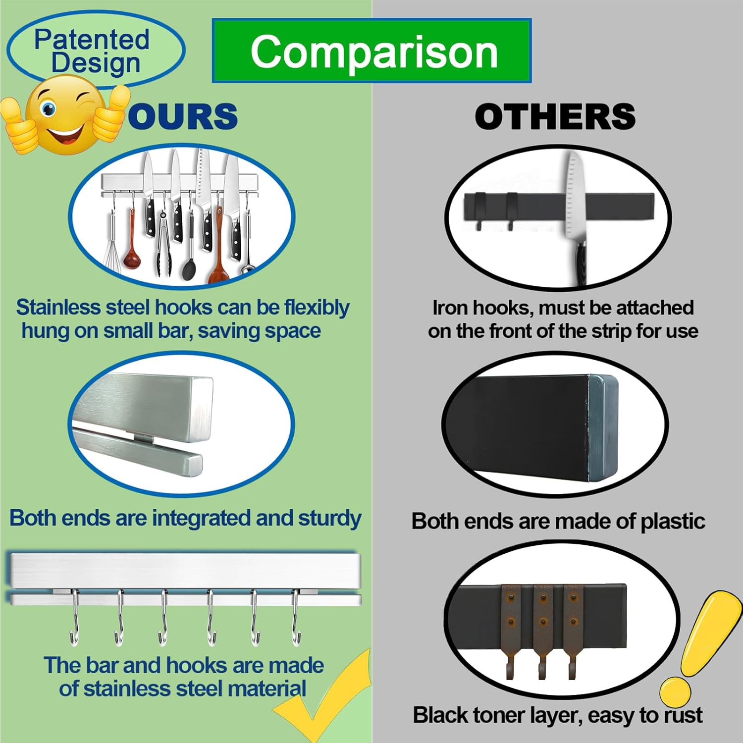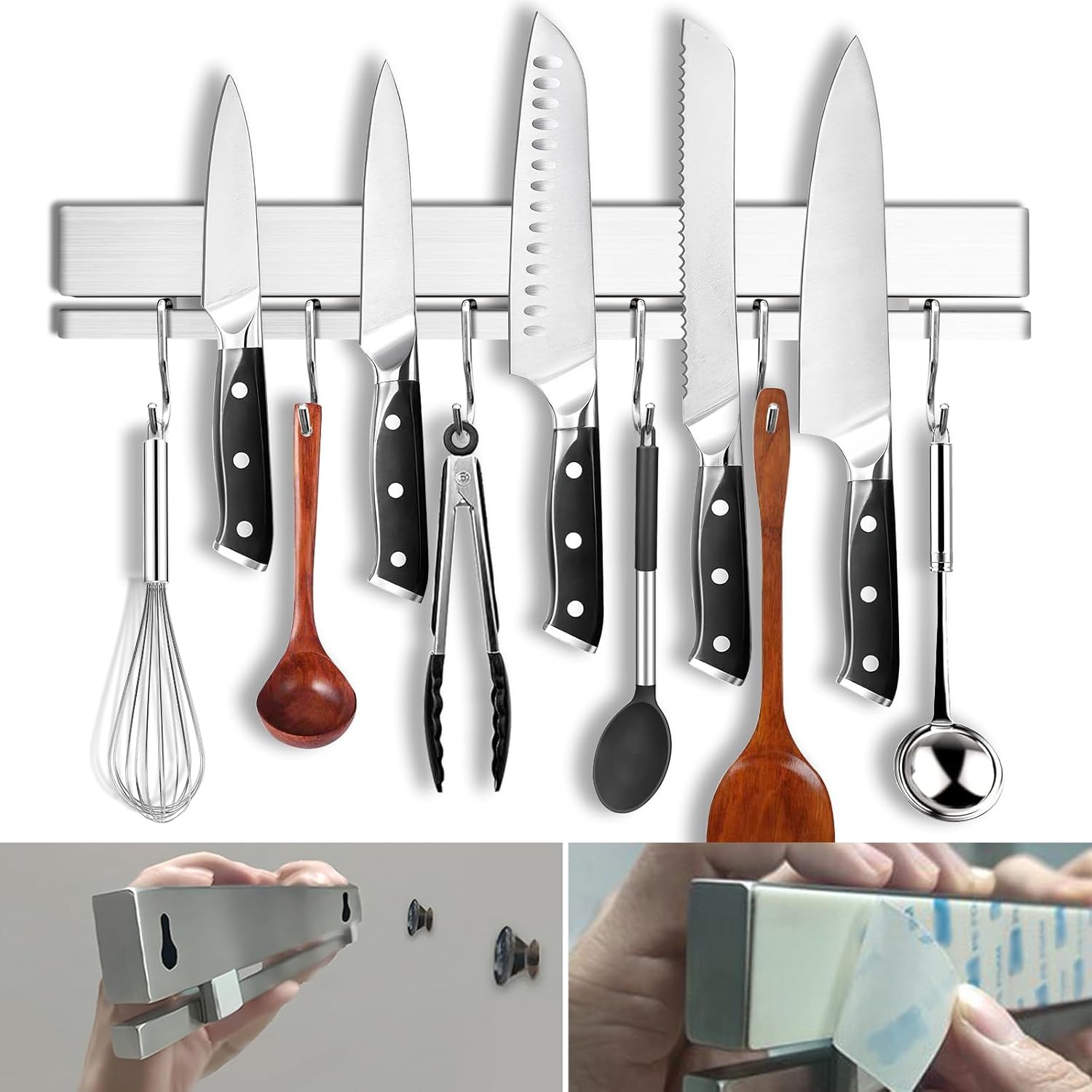 - 【Multifunctional Knife Magnetic Strip for Wall with 12 Hooks】This 17-inch kitchen magnetic knife strip conveniently stores 5-8 knives and includes 12 hooks for hanging non-magnetic utensils or accessories. Optimize your space, perfect for kitchens, garages, bathrooms, and RV organization and storage.